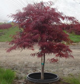 A small rounded tree with gracefully cascading branches. The dissected leaves are a bright red in the spring, maturing to a deep burgundy red. The color holds very well through the summer. The fall color is a bright red. Growth habit is like a 'Crimson Queen'. It prefers well-drained, acidic soil, and some protection for summer sun. Selected in New Zealand.