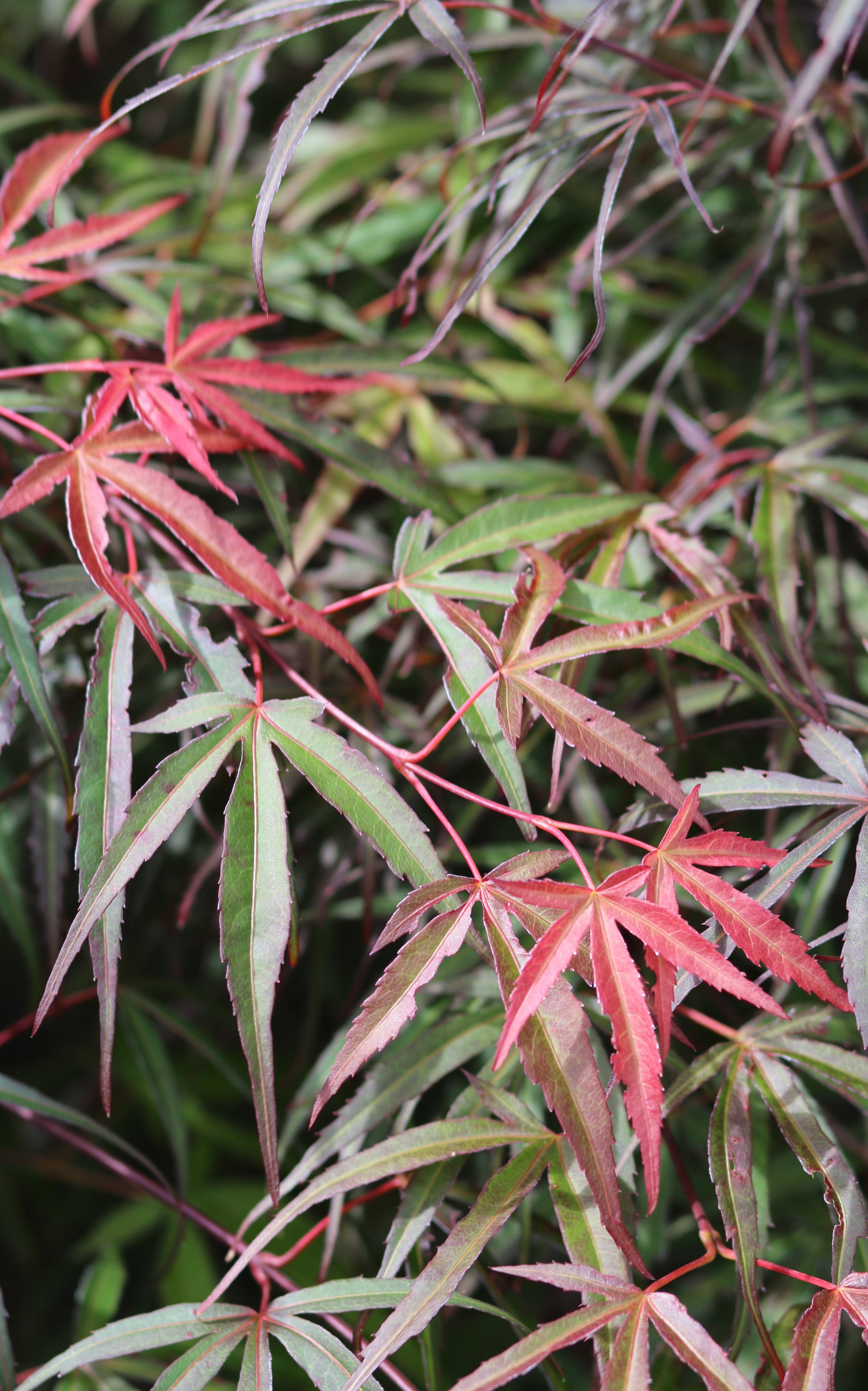 A slow growing rounded tree. The horizontal branches tips tend to curve down, giving the tree a graceful, lacy effect. The foliage is red and strap-like, and matures to bronzy red by late summer. The fall color is a bright red. The delicate foliage inspired the name. Prefers well-drained, acidic soil and some protection from summer sun. This is an introduction from Canada.