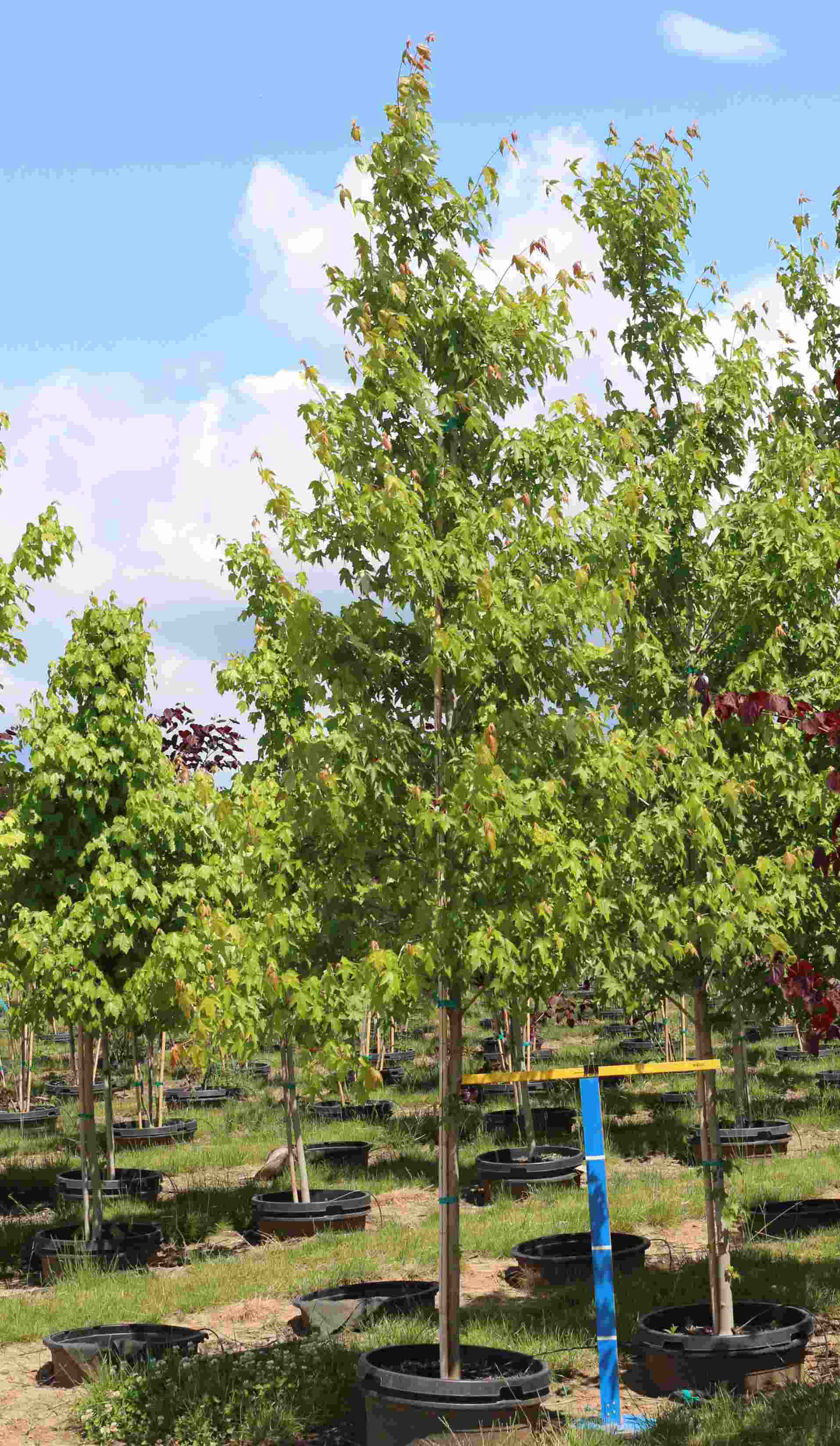 A pyramidal tree that is hardy and low maintenance. The branches are more closely spaced than the similar 'Autumn Blaze. The fall color is rusty orange to burgundy. It tolerates alkaline, acid, or wet soils and urban conditions. Reported to be more wind tolerant than similar trees. This is a quick growing shade tree, suitable for parks and large gardens.