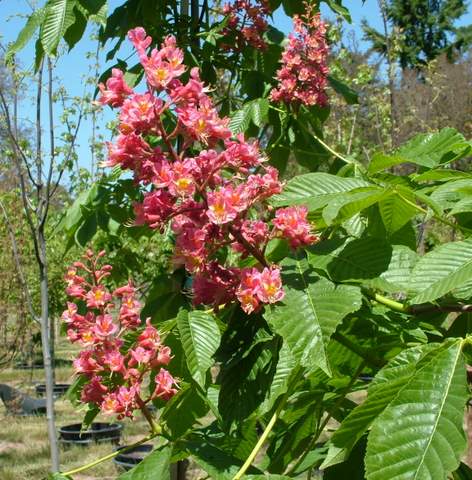 This is a dense, rounded tree with dark green leaves that emerge lighter green in spring. The foliage is not susceptible to leaf scorch. The palm-shaped leaves turn yellow in the fall. Showy spikes of dark pink flowers with yellow eyes emerge in spring. Prefers full sun to part shade in well-drained soil. It was selected at the fort with the same name in Washington, D.C.