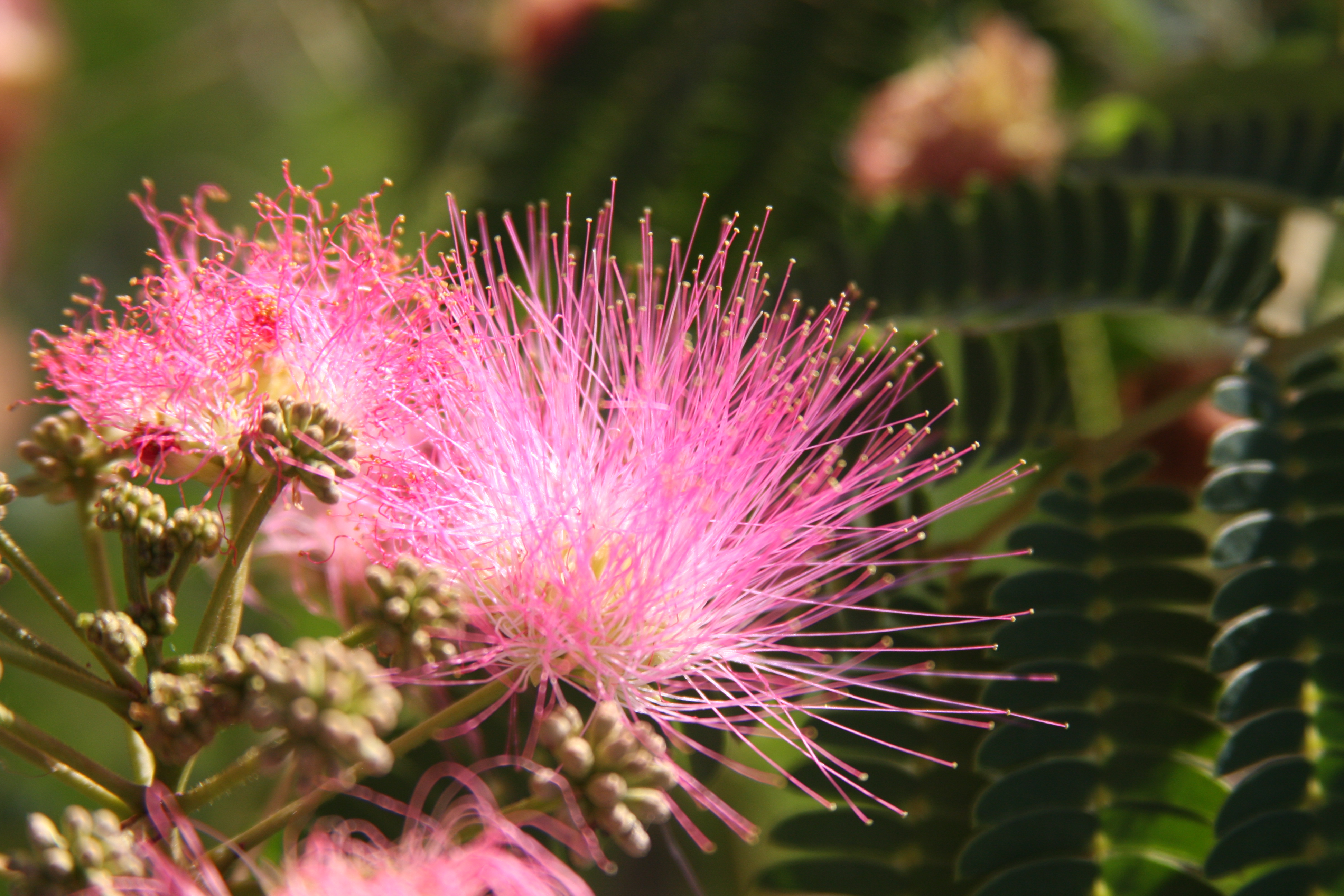 A broad, spreading tree with finely textured foliage and pink, silky, 'powder puff' blooms in the summer. It is sometimes grown as a multi-stemmed tree. Adapts well to drought, high pH and soil salinity, as long as the soil is well-drained. It prefers a site in full sun. Also called Silky Mimosa or Persian Silk tree and it is a member of the legume family.