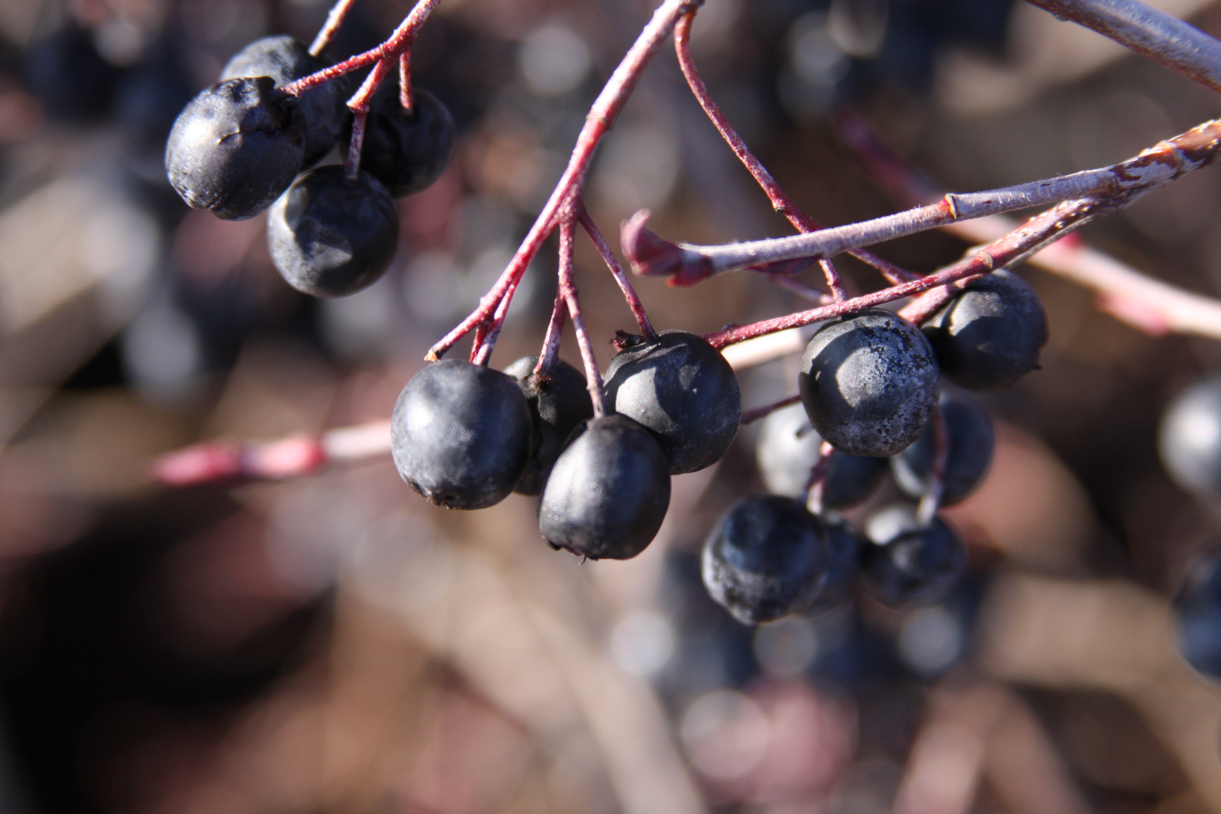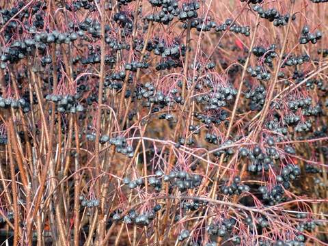 An upright, suckering shrub with black fruit in the fall. The leaves are glossy, dark green with pubescence underneath, turning brilliant reds and purple in the fall. Adapts well to poor soils, both wet and dry. It is one of those tough plants that can thrive just about anywhere and provides year-round interest.