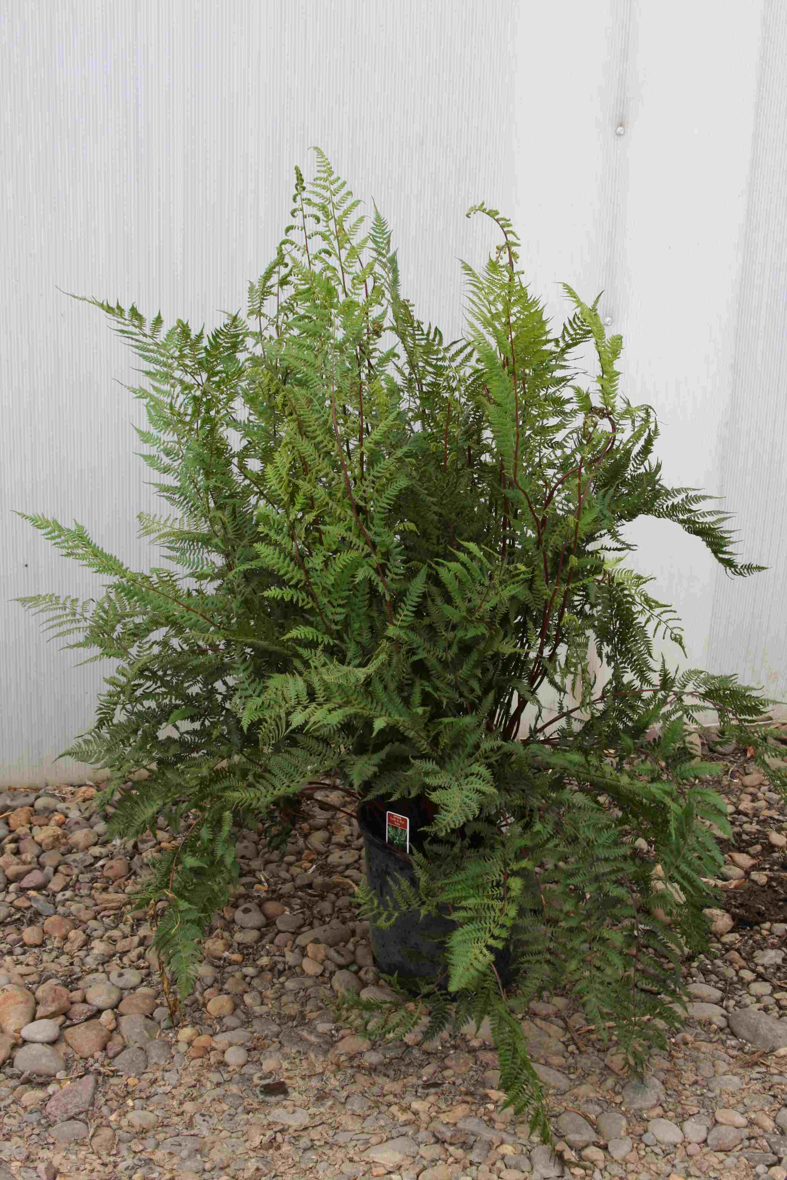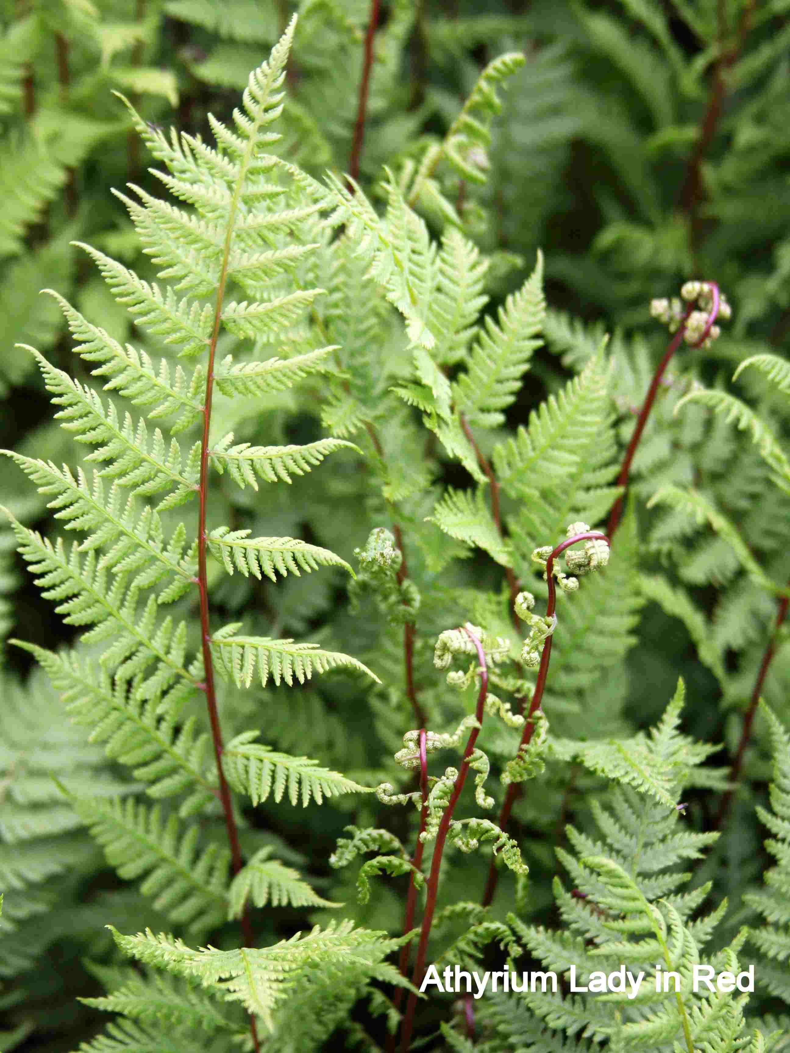 A delicate and very hardy Lady Fern with a fountain of 30" bright red stems that create a lacy contrast with surrounding groundcover. Plants may need several dormant seasons before attaining best stem color. The fronds are a lime green. New growth occurs throughout the season, for a fresh look all summer. It will grow best in full to part shade in an organically rich, moist soil.
