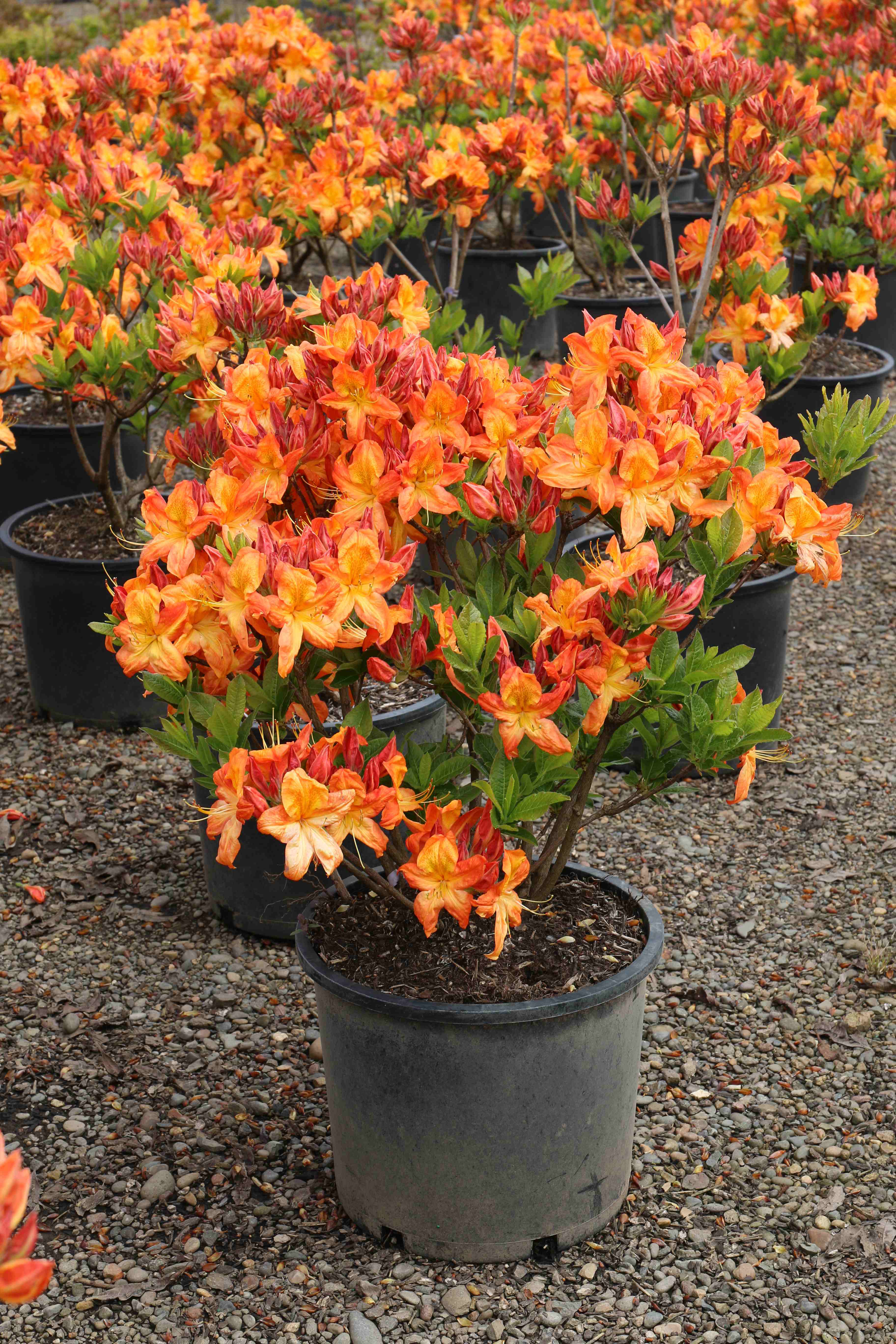 An upright, spreading shrub with disease-resistant foliage. Red buds open to large, soft yellow-orange flowers, shading to strong reddish orange at the margins. A prolific early to mid-season bloomer. Prefers moist, well-drained acidic soils and full sun to part shade. Bred and selected by Canby, Oregon nurseryman Ivan Arneson.