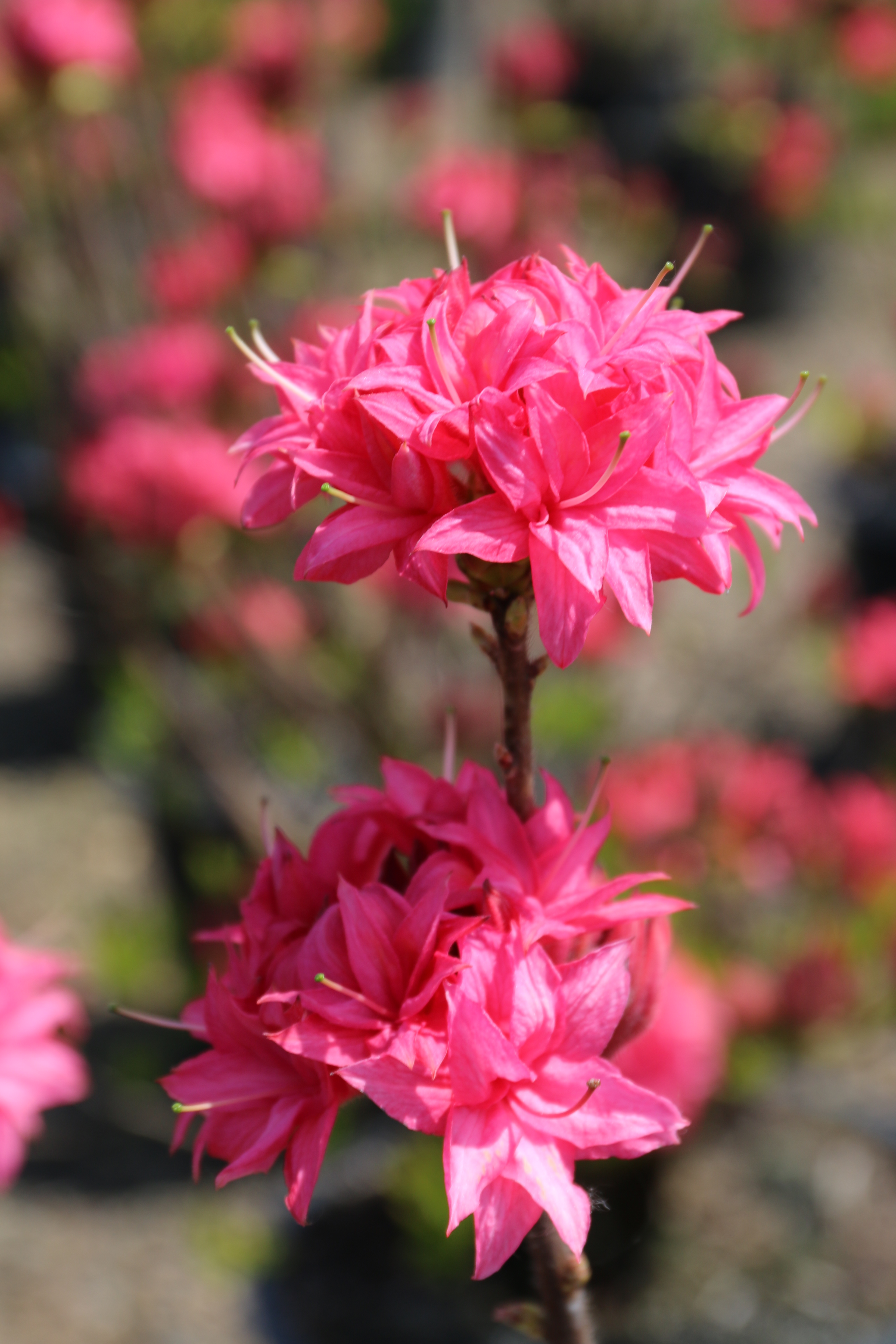 Bright, bubblegum pink semi-double flowers, uniquely display their pointed petals in tight, ball-shaped trusses. The blooms appear in mid-season. The form is upright and open. Prune after flowering as needed. Prefers moist, well-drained, acidic soil and full sun to part shade. A Knap Hill selection.
