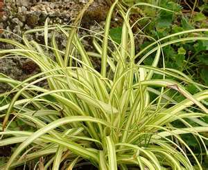 An evergreen perennial sedge that grows in cascading clumps of leathery green leaves with creamy yellow centers. Prefers moist soils and part to full shade. Requires little maintenance once established. If the foliage becomes too tattered, prune back hard. Plant in drifts, as an edging in a shrub border, or in mass plantings.