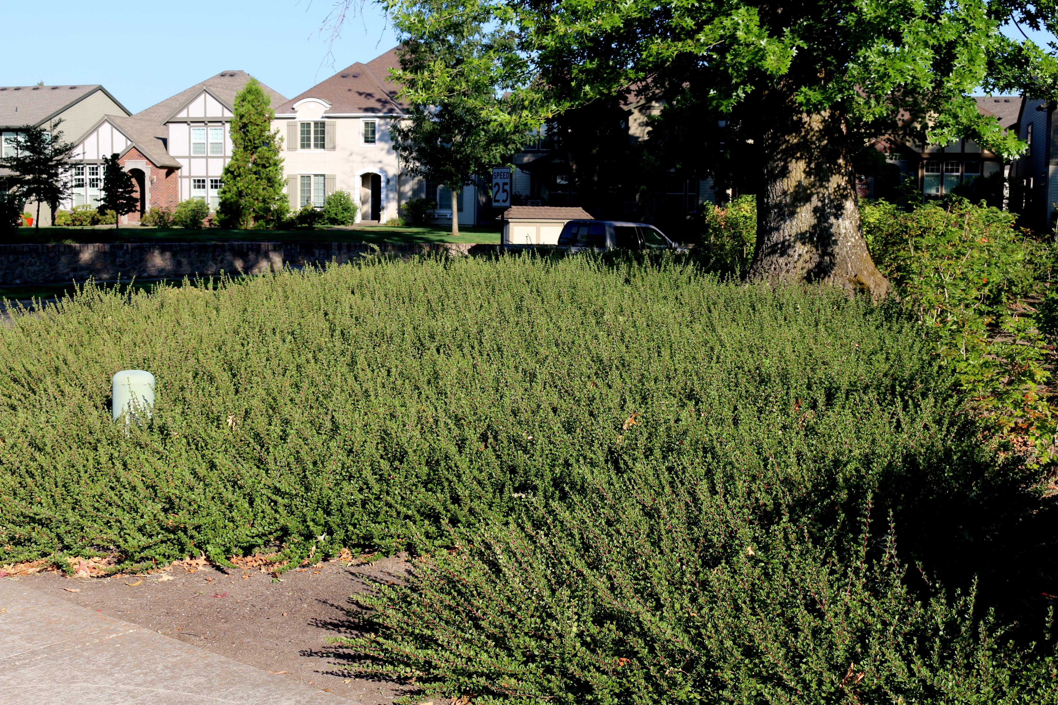 A low spreading groundcover with rounded, leathery, dark green leaves and arching branches. Small blue to purplish flowers appear in the spring in clusters along the branches. Prefers full sun and well-drained soil. Takes drought once established.