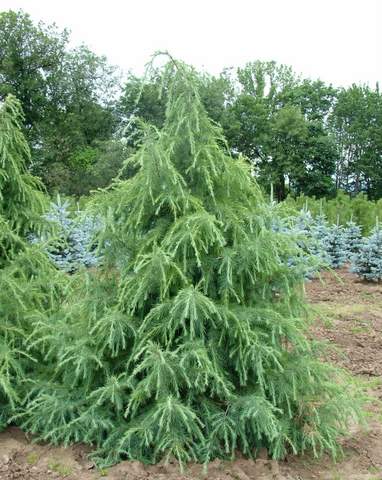 A broadly pyramidal tree with graceful, pendulous branches. The foliage is grayish-green to almost silver-blue. The cones can look like owls sitting on top of the branches. It prefers full sun and a deep, moist, well-drained soil.