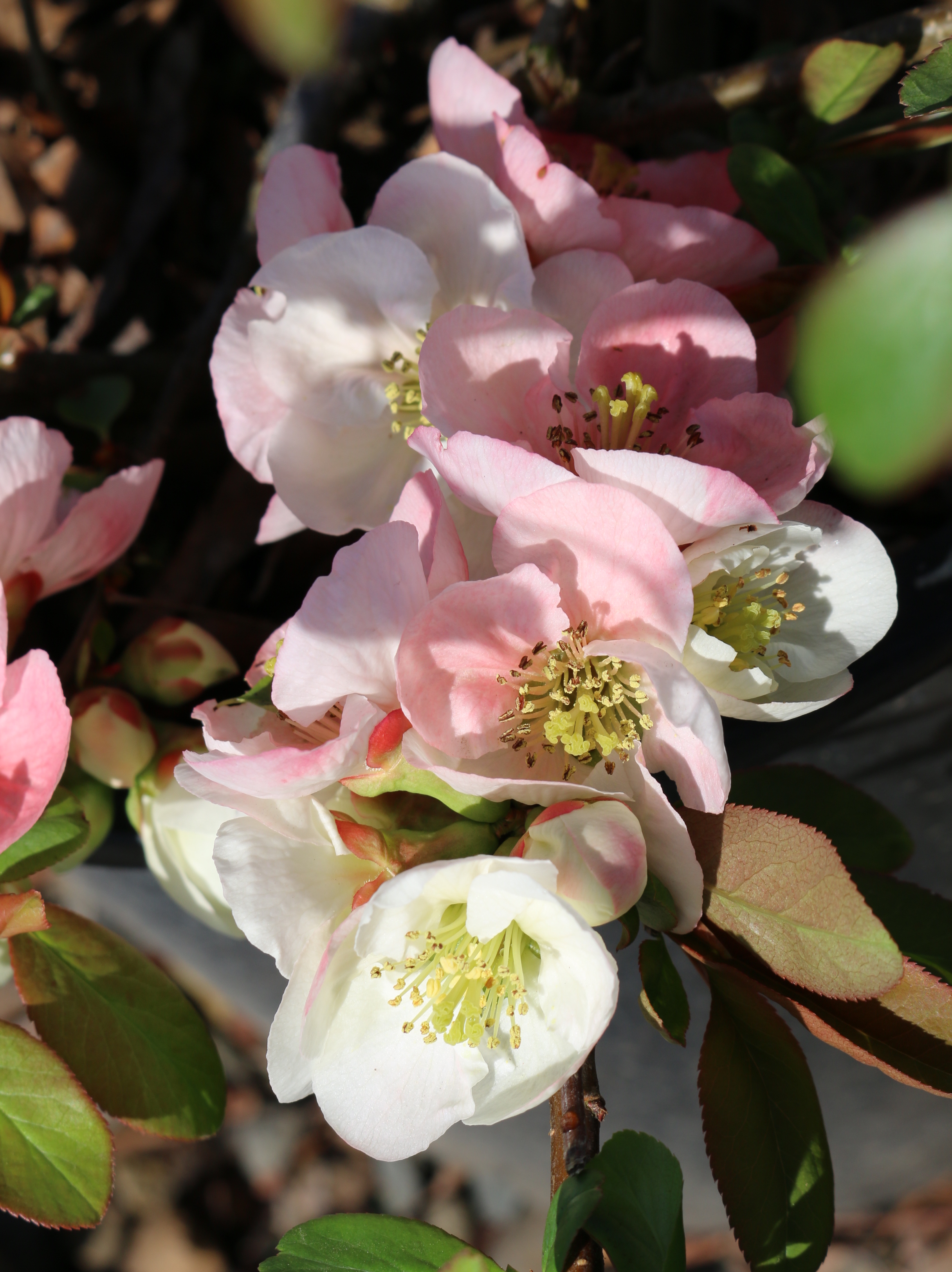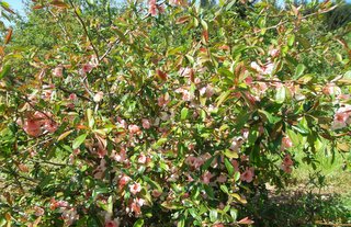 An upright growing shrub with pink, white, red, and combination flowers on the same branch. The flowers are followed by fruit, safe to eat, but bitter. It blooms in the early spring. Prefers full sun to part shade, slightly acid, well-drained soil. It will tolerate dry sites as well. Great for a border, a barrier plant, or for mass planting.