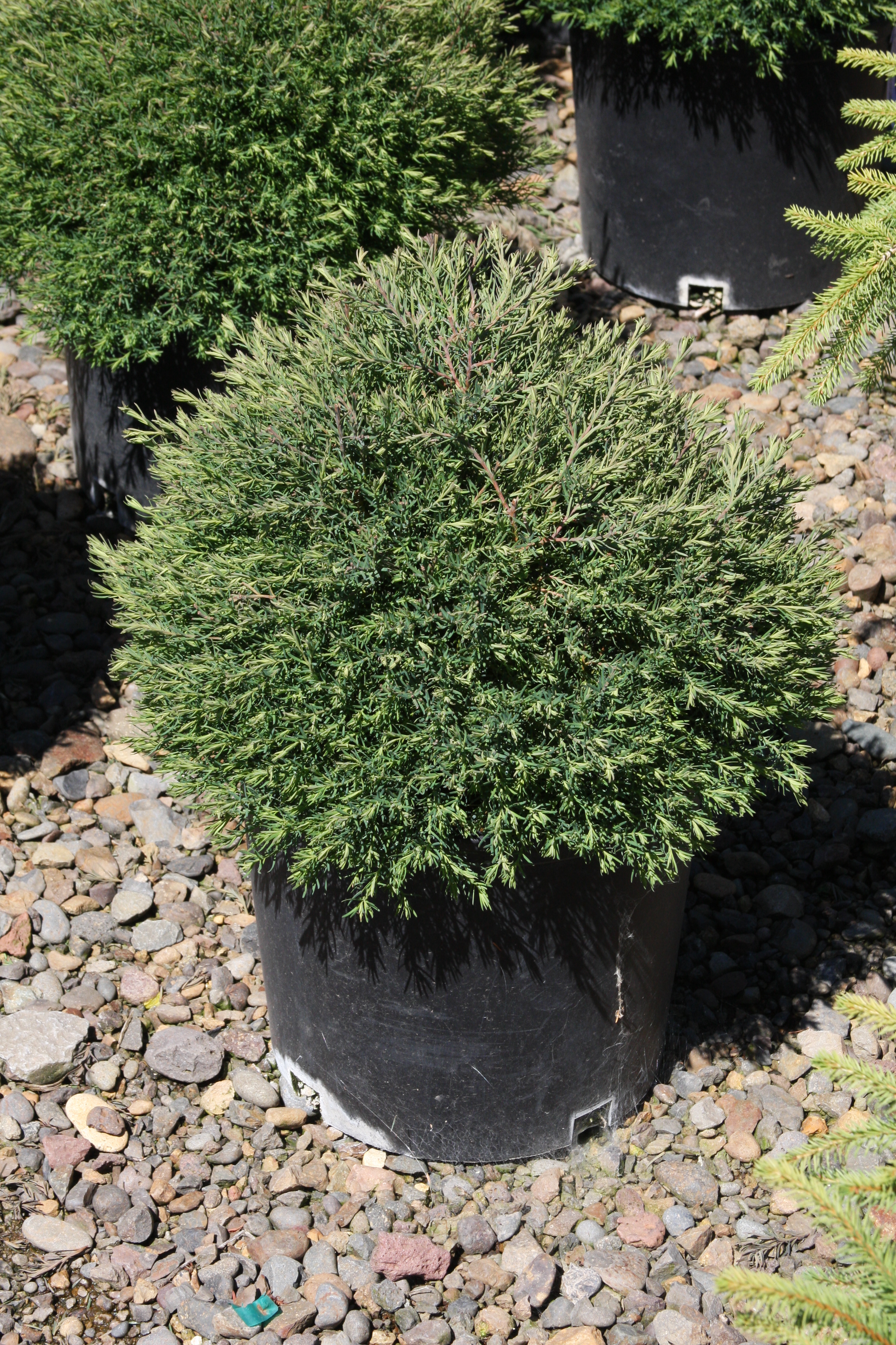 This will form a compact, pyramidal shrub with soft blue-green foliage that turns a bronze-plum in winter. The texture is quite fluffy in appearance, and will take well to light shearing. It prefers a moist, well-drained soil. It will grow best in full sun. Useful in foundation plantings or as a hedge.