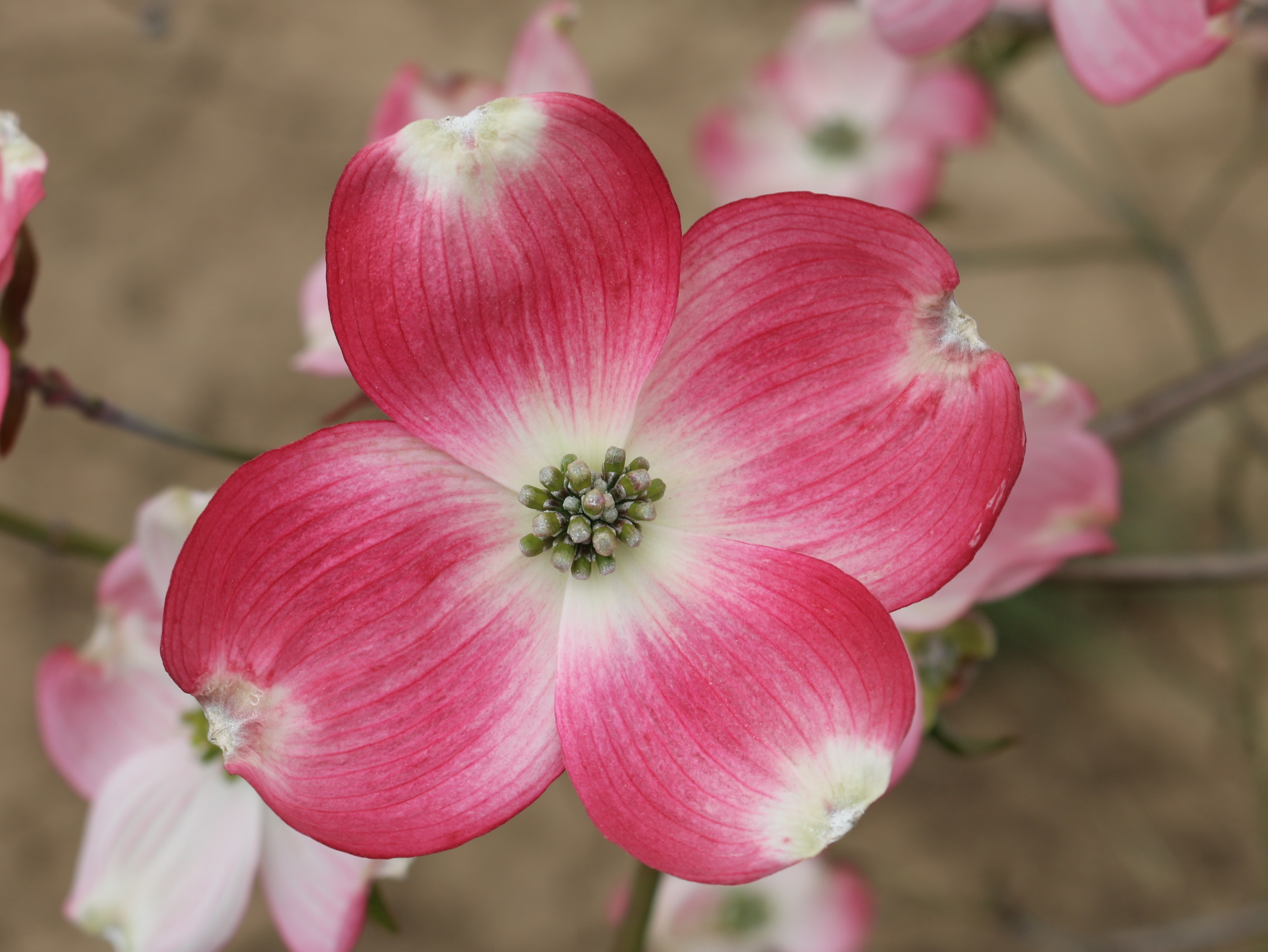 A small vigorous tree with wide horizontal branching, that can develop a layered effect. The reddish pink bracts have a white eye. Many consider this one of the darkest pink-red selections. The fall color is deep red to burgundy. It is resistant to mildew and more drought tolerant than other Dogwoods. It prefers moist, well-drained soil in full sun or part shade. Introduced to the trade in the mid 1990's by Commercial Nursery. PP 10,166.