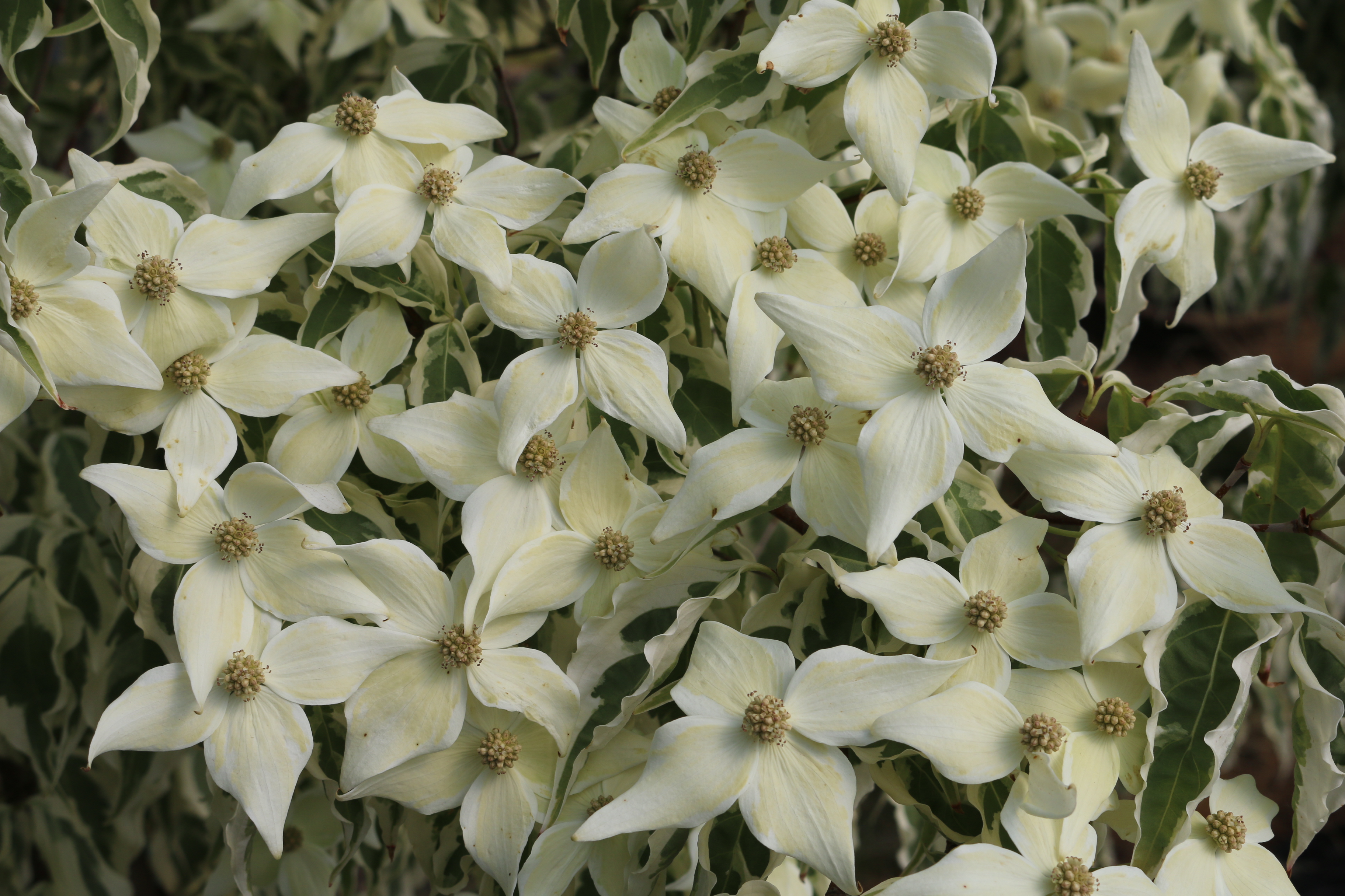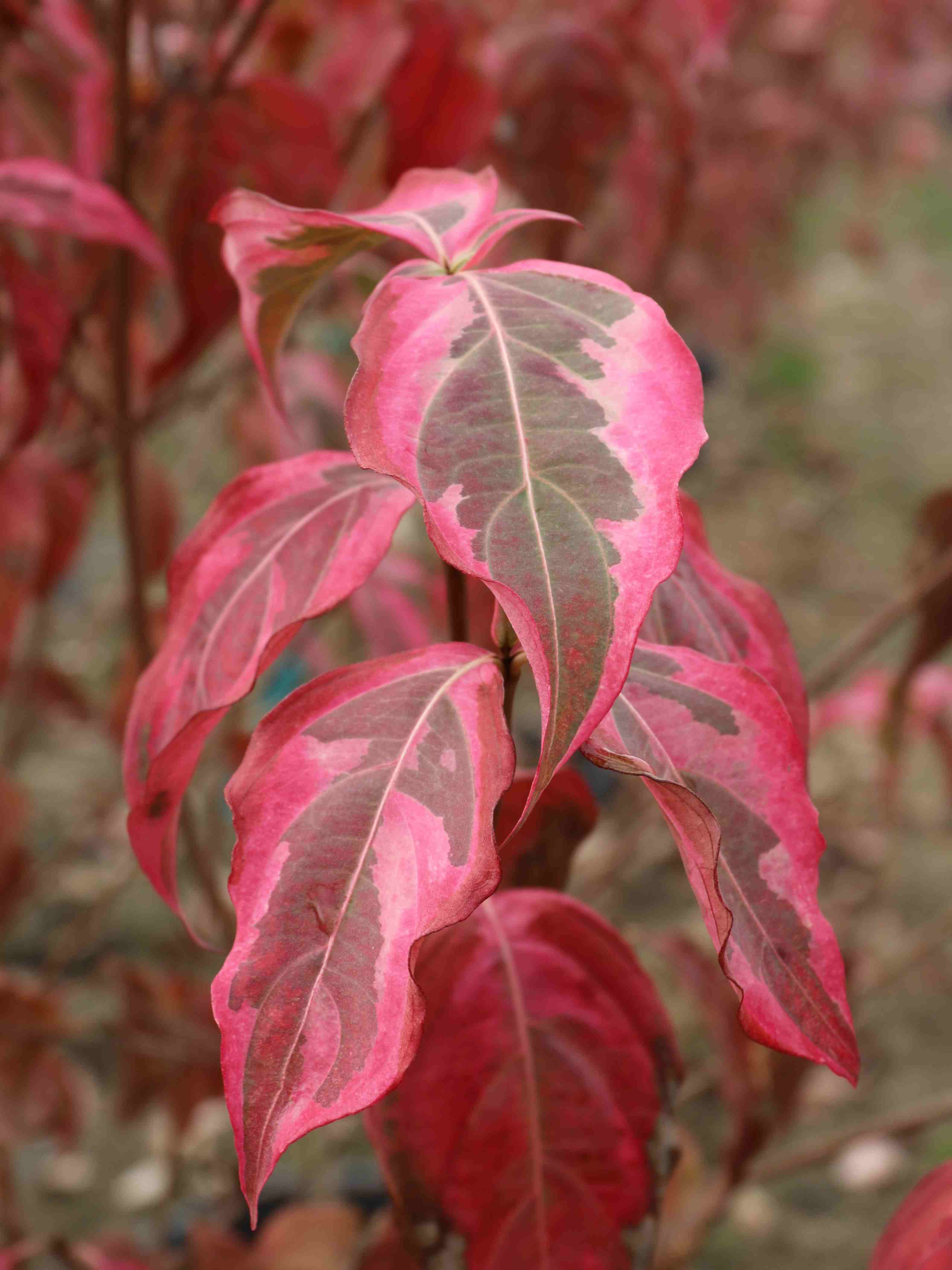 An upright, vase shaped tree with large white bracts in late spring. The early spring leaves have pink and white margins, giving the whole tree a pink wash. In summer, the margin contrasts well against the green; very crisp looking. In fall, the margins turn to pink and orange. It prefers sun to partial shade, and a well-drained soil. It was introduced by Talon Buchholz.