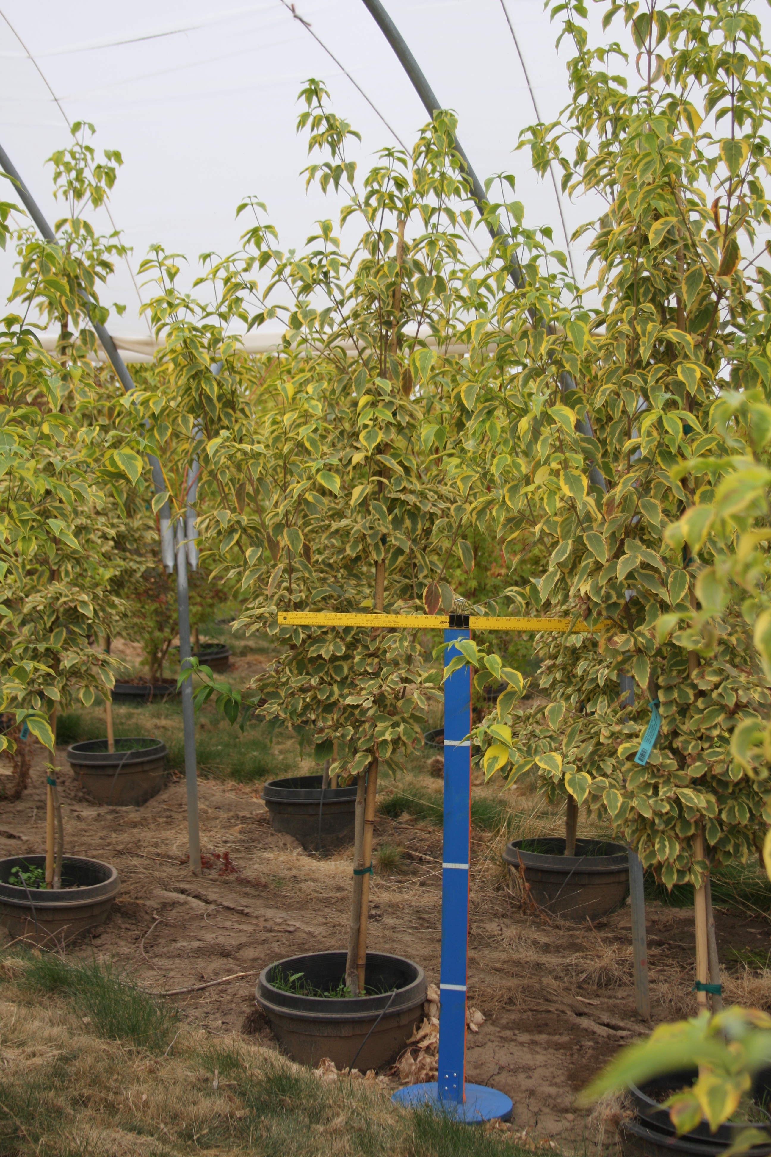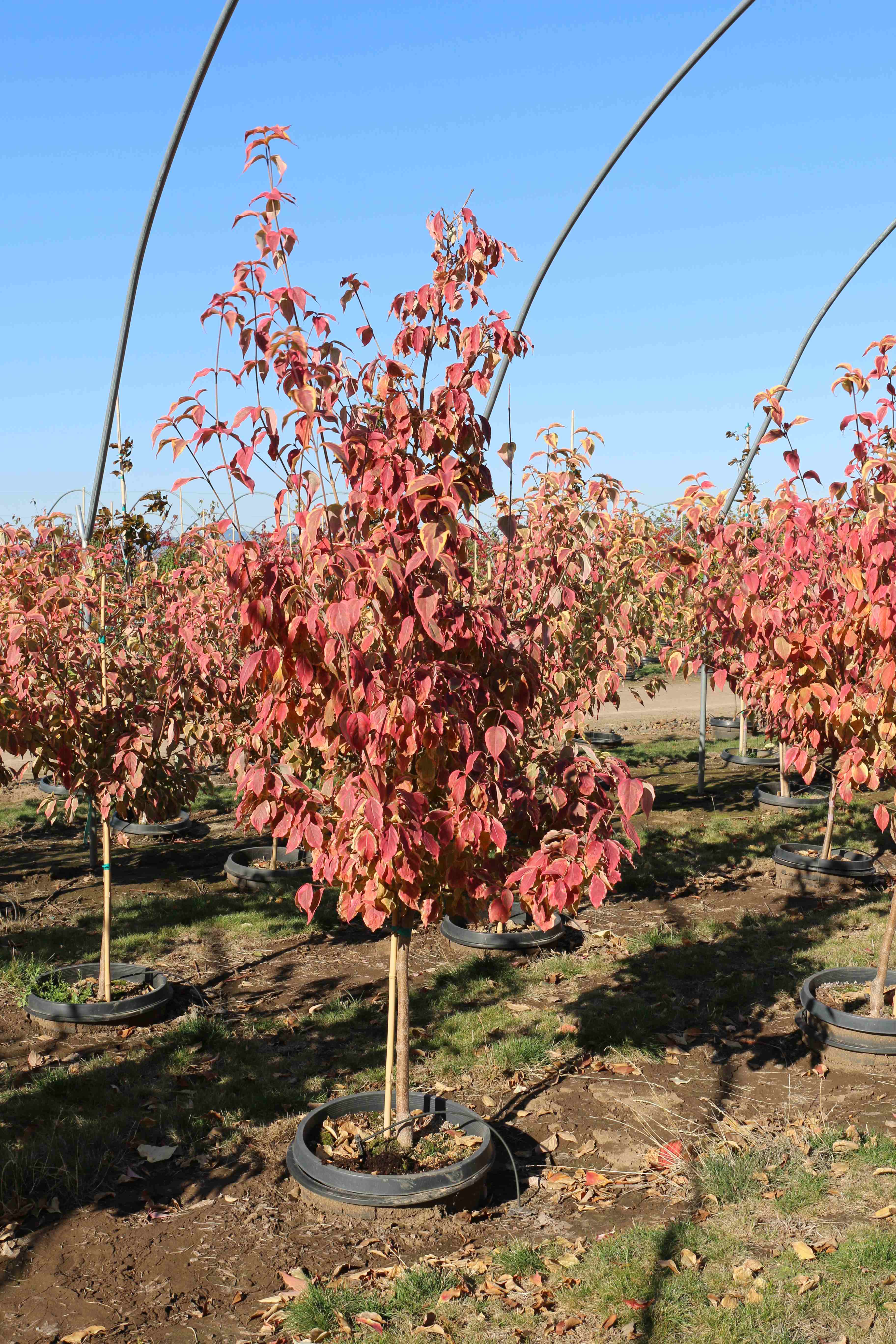This grows into an upright tree with yellow-gold edged green leaves, with some blushes in pink tones. The fall color is pink to red to brilliant red as temperatures cool. Four pointed bracts in creamy white appear in mid-spring. Fruit develops in late summer. It prefers full sun in rich, well-drained soil. Introduced by Crispin Silva. PP 22,765.