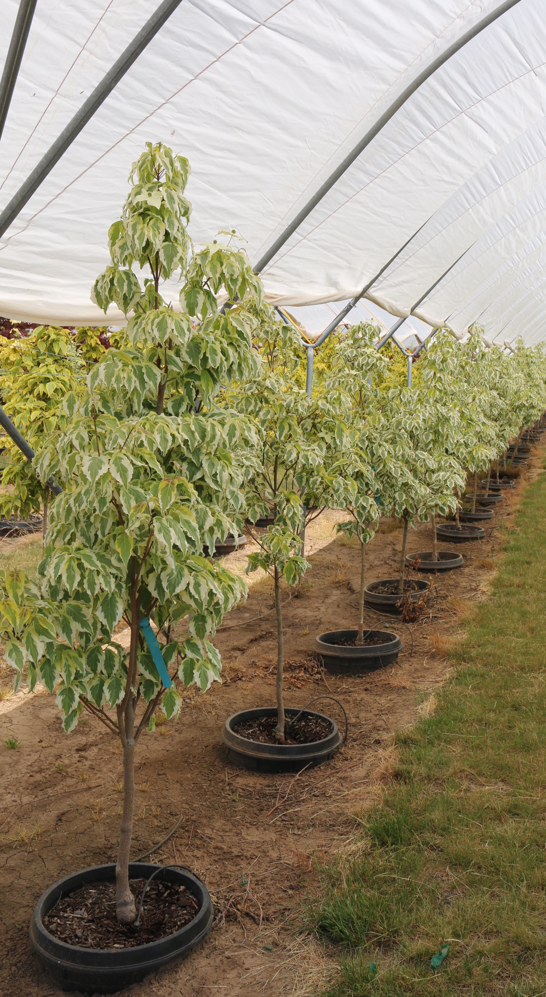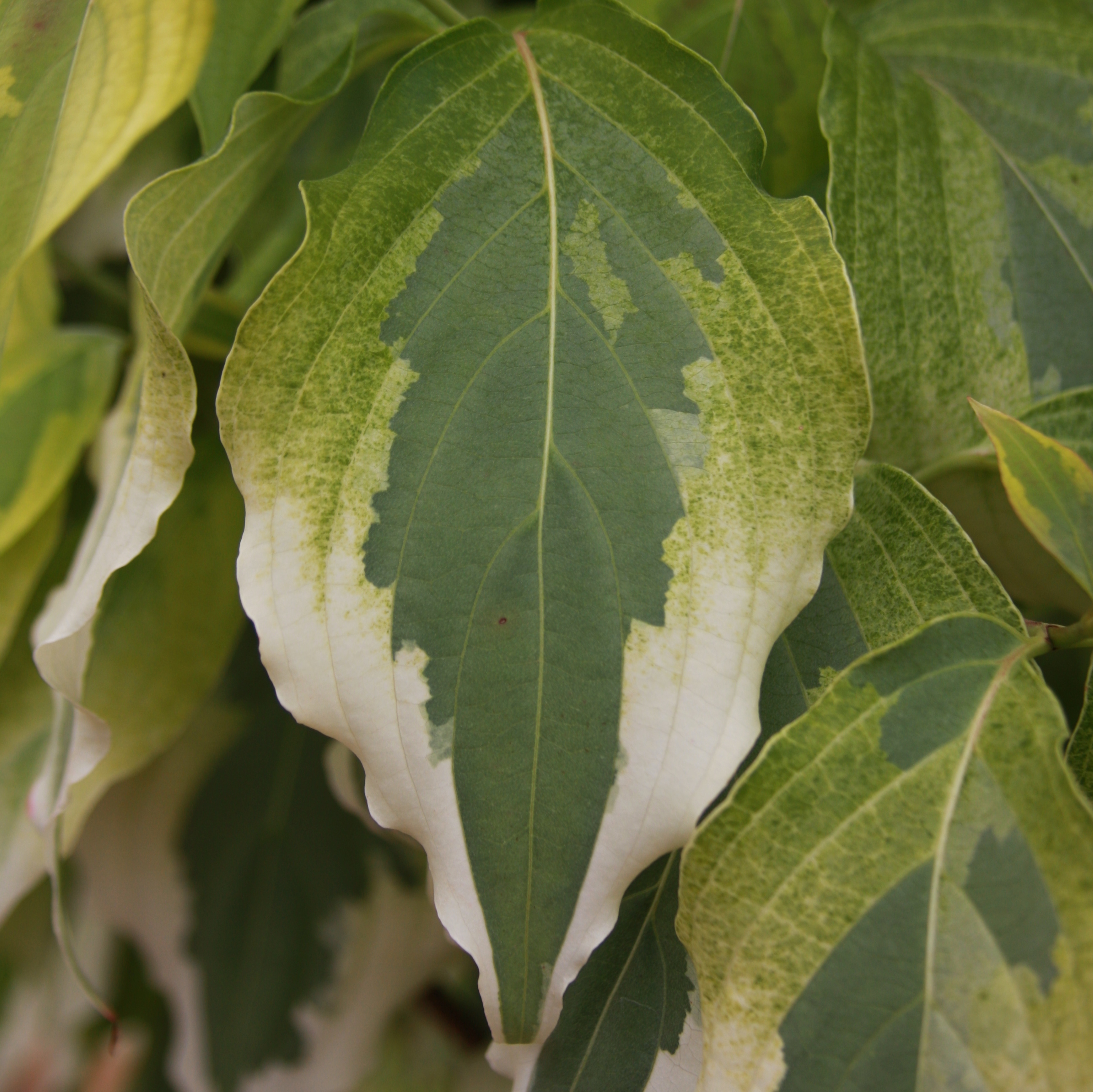 A small upright tree with beautifully colored variegated foliage. The leaves are green and white dappled with some gold at the base on new growth. Bright red fall color. Creamy white bracts appear in the spring. Prefers sun or part shade and needs well-drained soil. PP 20,008.