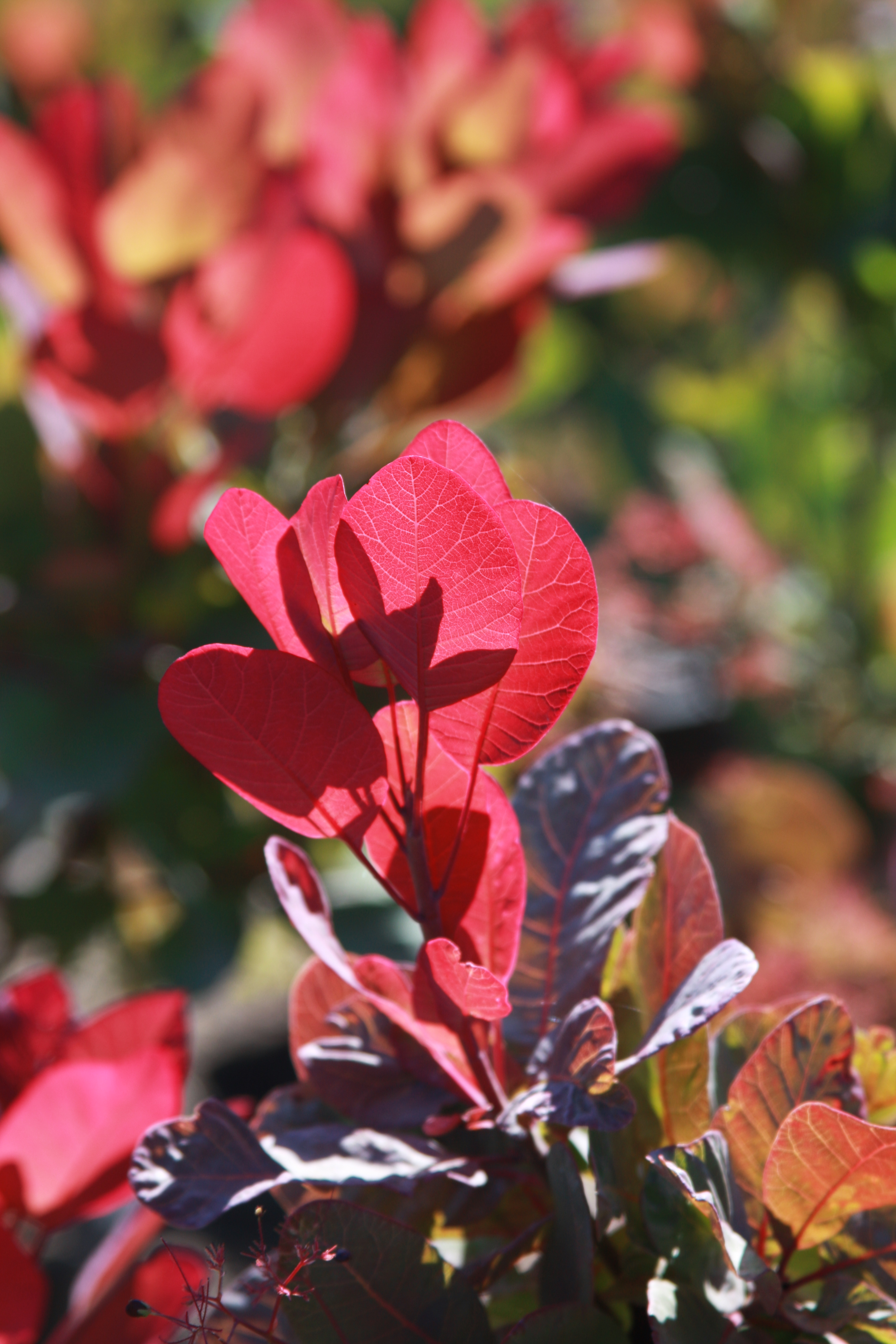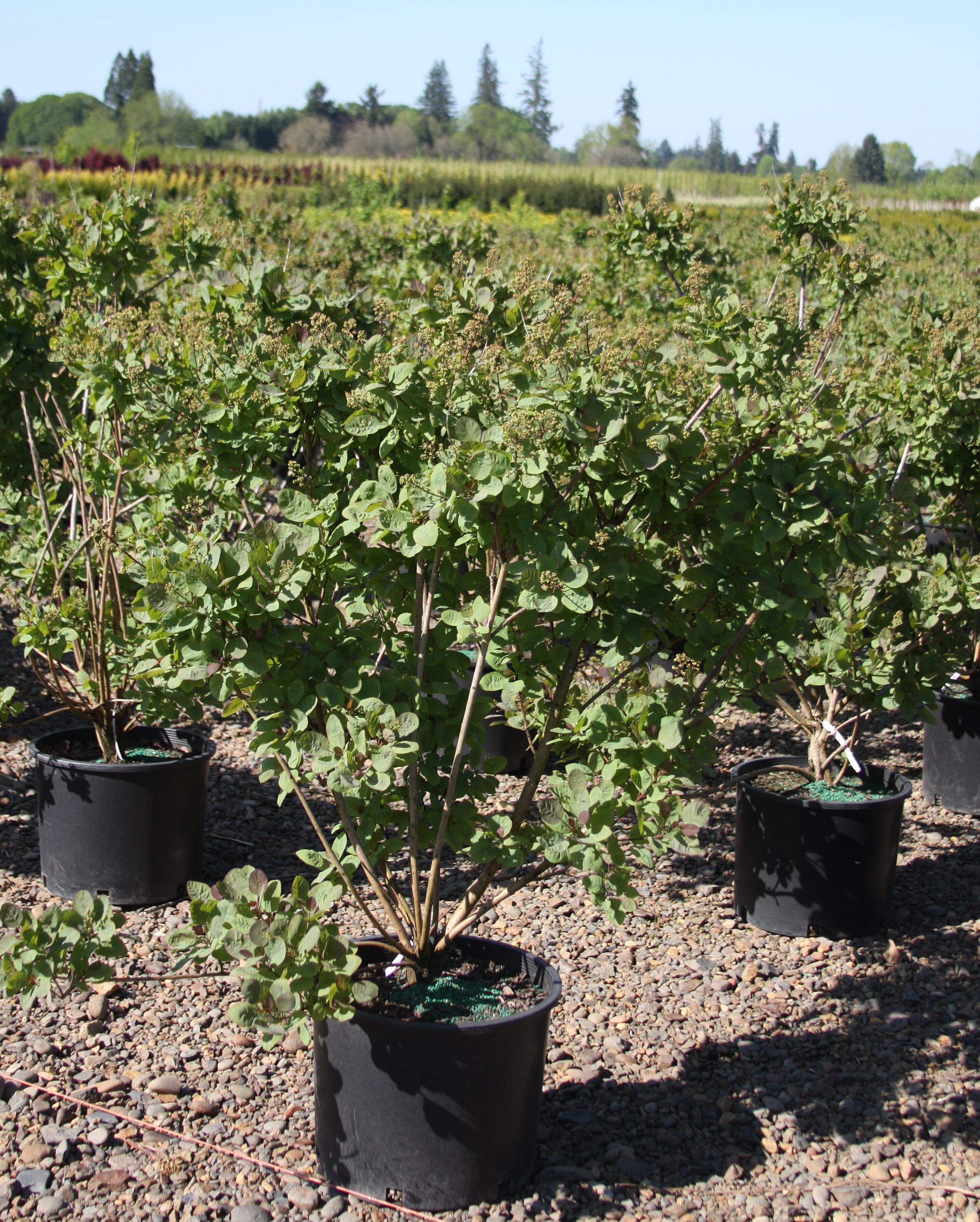 A broad, upright shrub. The large, rounded leaves emerge grey-purple in spring, changing to blue-grey at maturity. It has large, airy clusters of small, yellow-green flowers in the spring. The foliage turns bright reds in the fall. It needs well-drained soil and does best in full sun. It responds well to hard pruning. PP 19,035.