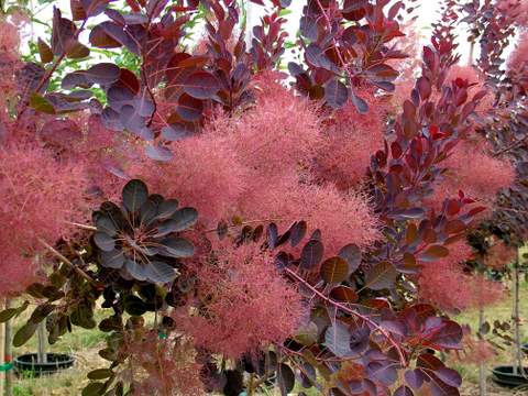 A multi-stemmed small tree, or large shrub with dark, purple-red foliage. The fall color is scarlet. Small flowers are held in large airy clusters and are followed by smoky-pink seeds. It needs well-drained soil and prefers full sun. It responds well to hard pruning.
