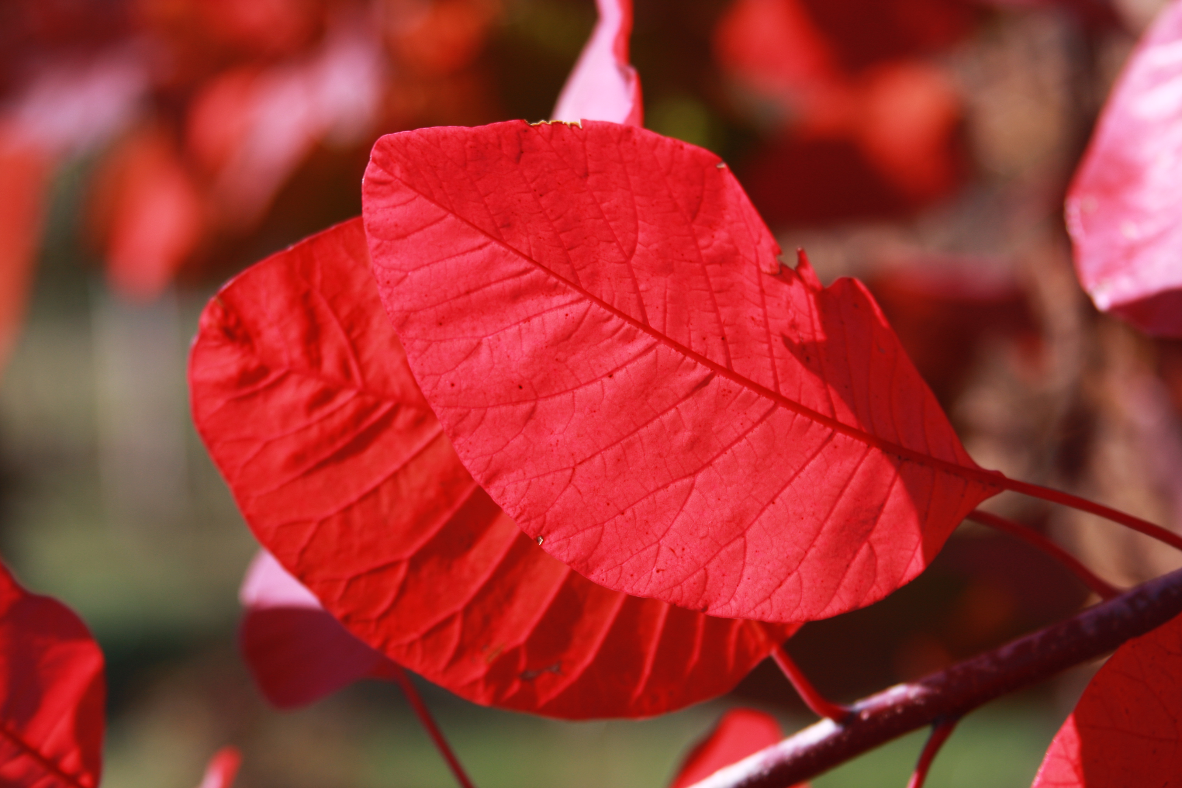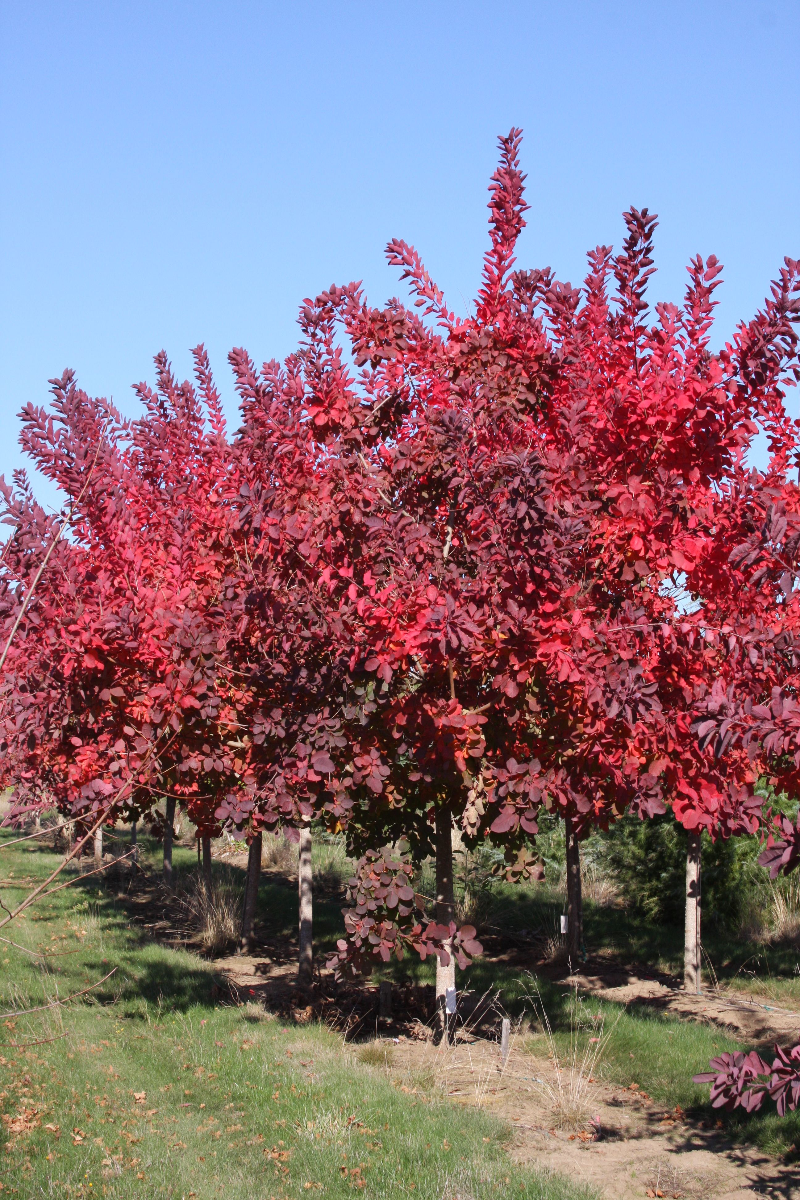 A large shrub, or small tree, with deep-blue green foliage. Leaves are bright red when young, and fall color is brilliant red, orange and yellow. The typical Smoketree pink flowers are held on a 14" x 11" panicle. It prefers full sun for best color and a well-drained soil. As with most Cotinus, it responds well to hard pruning. This is a hybrid of C. obovatus and C. coggygria.