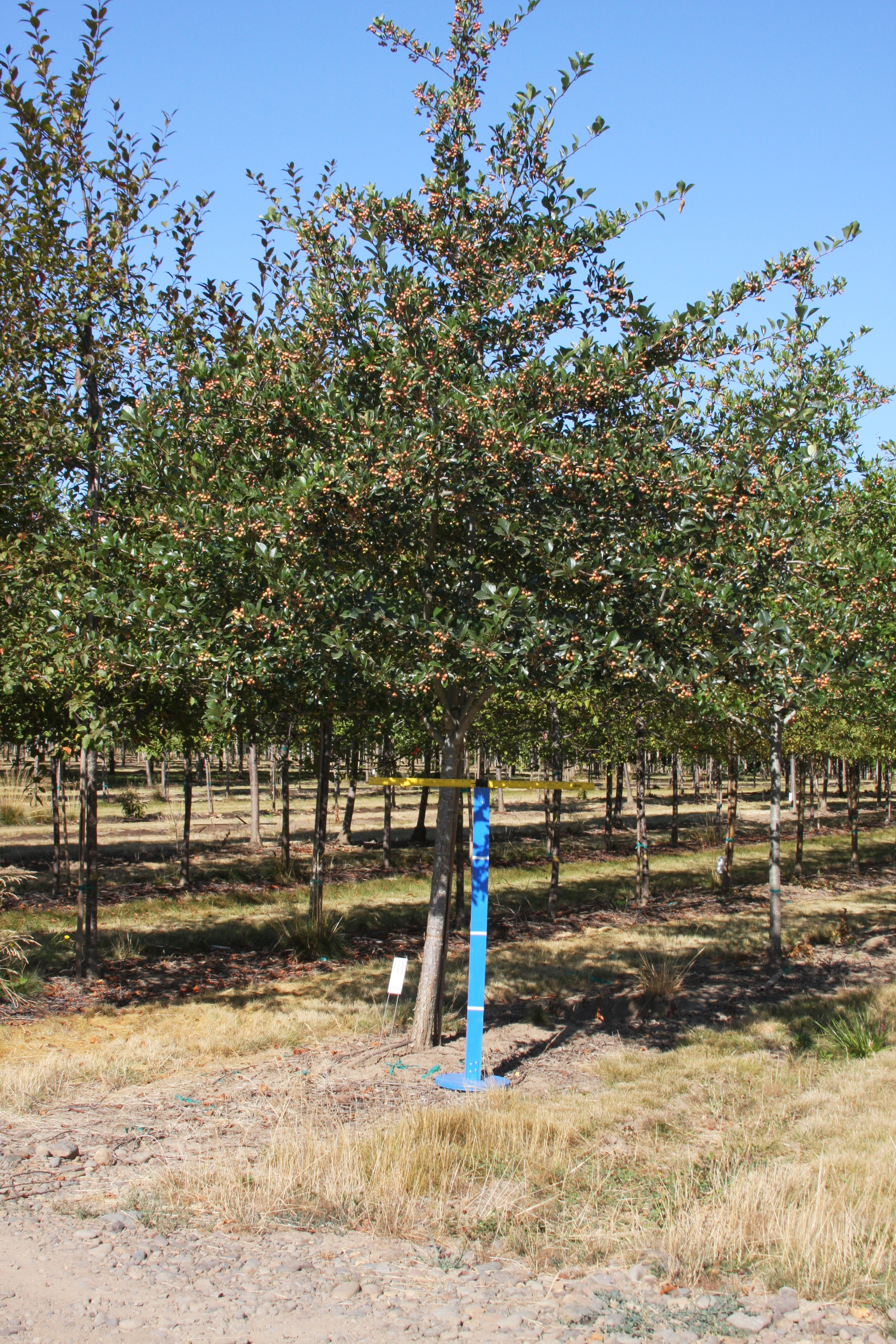 A small, rounded, thornless tree with glossy dark green, leathery leaves. The flowers are white, appearing in late spring, followed with bright red fruit. The fall color is orange. Disease resistant and tolerant of wet and poor soils. It prefers full sun, but will tolerate partial sun.
