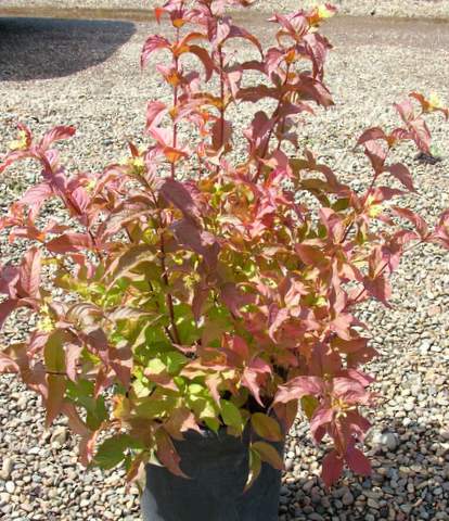A mounding, spreading plant with glossy, bronze-green foliage. Has small yellow flowers through summer. Fall foliage color is reddish. Grow in full sun in average, dry to medium moisture, well-drained soils. Prune if needed immediately after flowering. It is native to the northern United States, and grows best in cool summer climates.