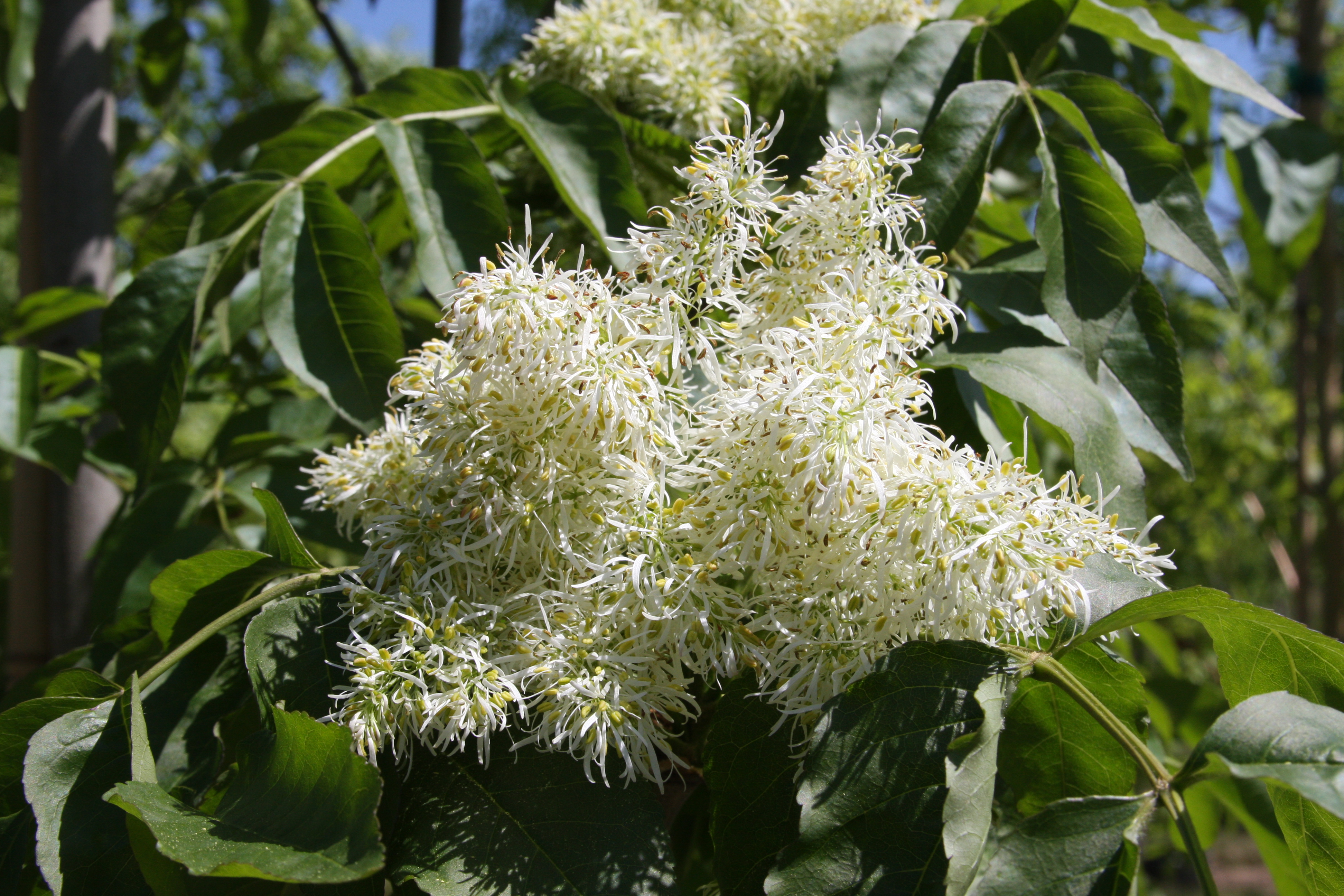A rounded, spreading tree with smooth gray bark. In late spring, white sprays of fragrant white flowers in clusters emerge. The summer foliage is medium green, the fall color is yellow with tinges of purples. The seeds may hang on until winter. It prefers full sun, and moist, fertile soils, but is tolerant of a range of soil pH and poor drainage.