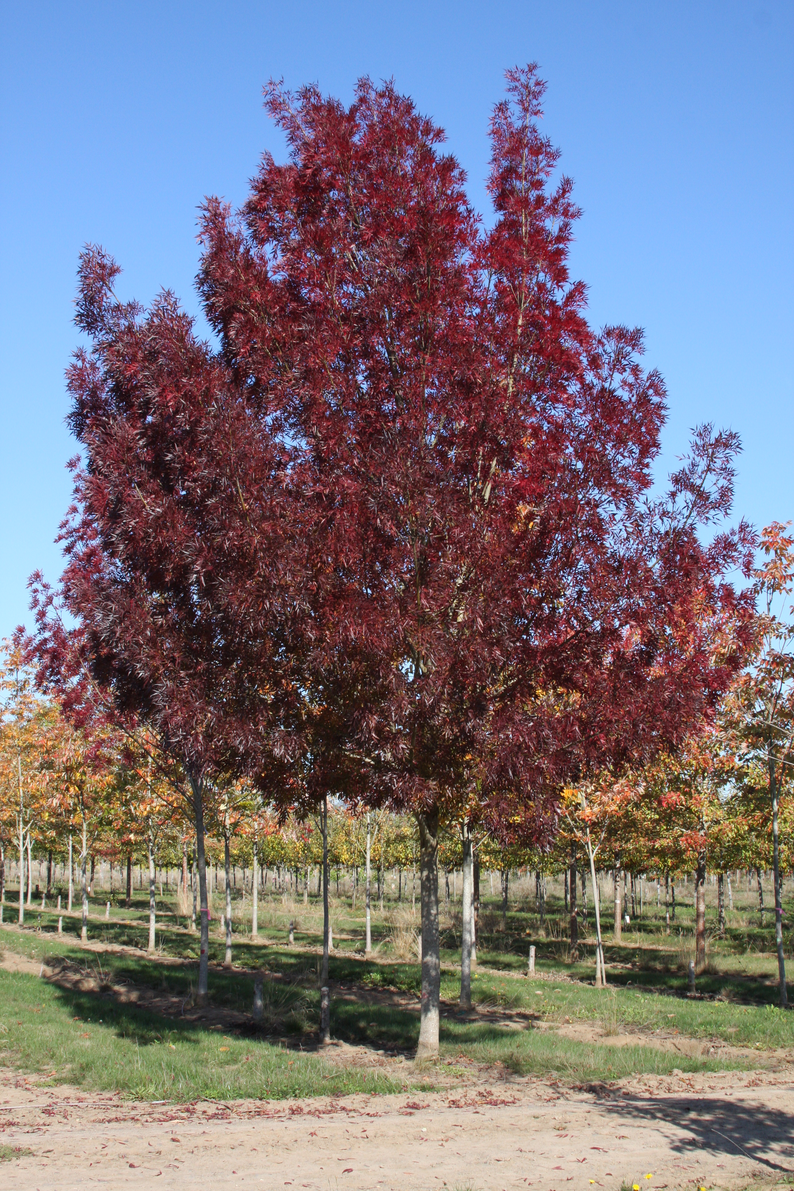 A rounded tree with fine-textured narrow leaflets. The summer foliage is a glossy dark green. The fall color is a rich, deep burgundy, with some brighter reds. It is adaptable to a range of soils, and performs best in full sun in moist, well-drained soils. Also know as Claret Ash or Flame Ash. Originated near Adelaide in Australia and named after Raywood Gardens in the early 1900's
