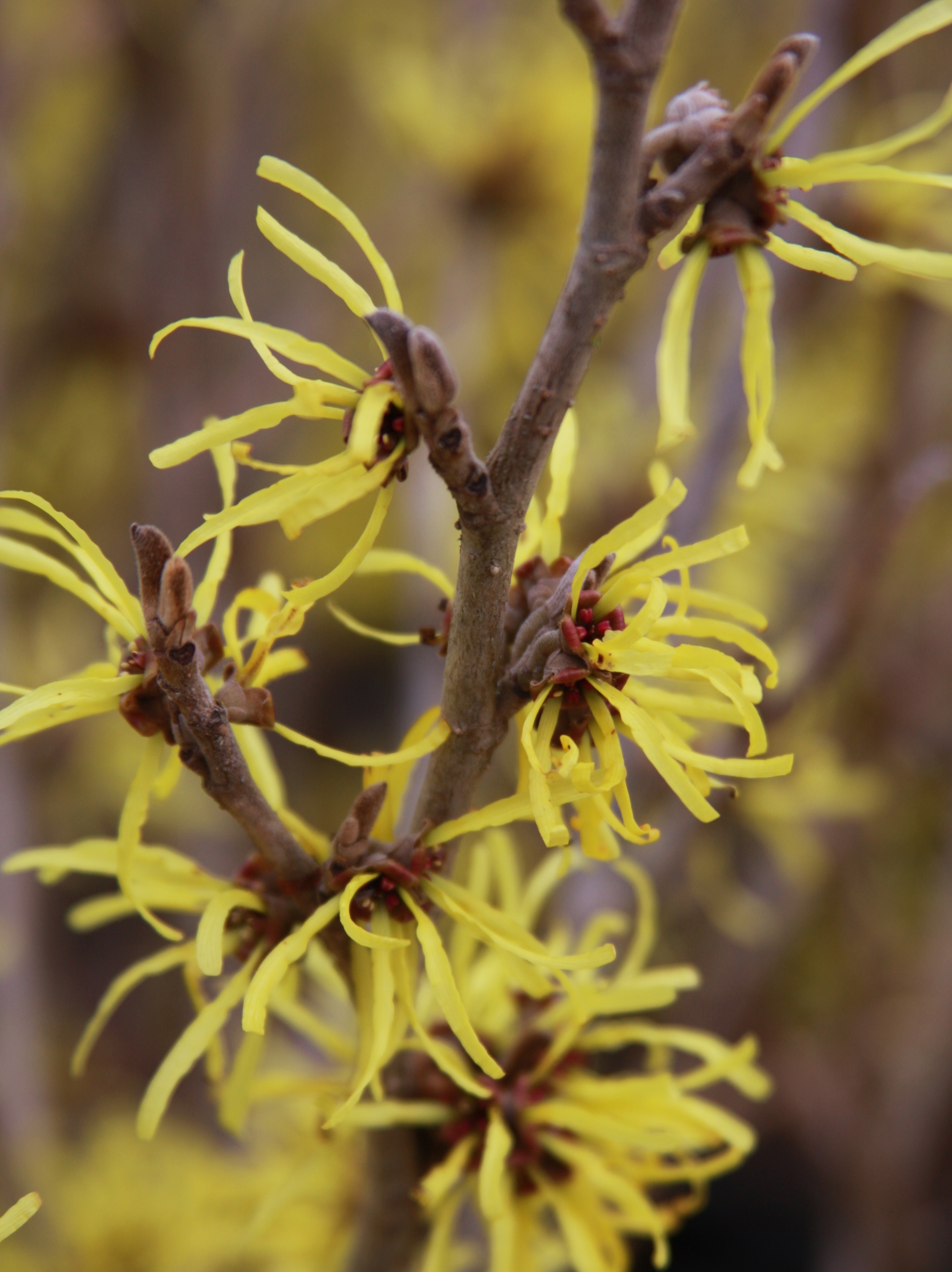 A compact, upright shrub with lightly fragrant, clear yellow flowers in the late winter to early spring. The new growth emerges yellow green, with some purple tints. The fall foliage color is yellow with orange highlights. It prefers full sun to part shade, with the best flowering in full sun. It needs an average, well-drained soil. Prune after flowering as needed for size and shape.