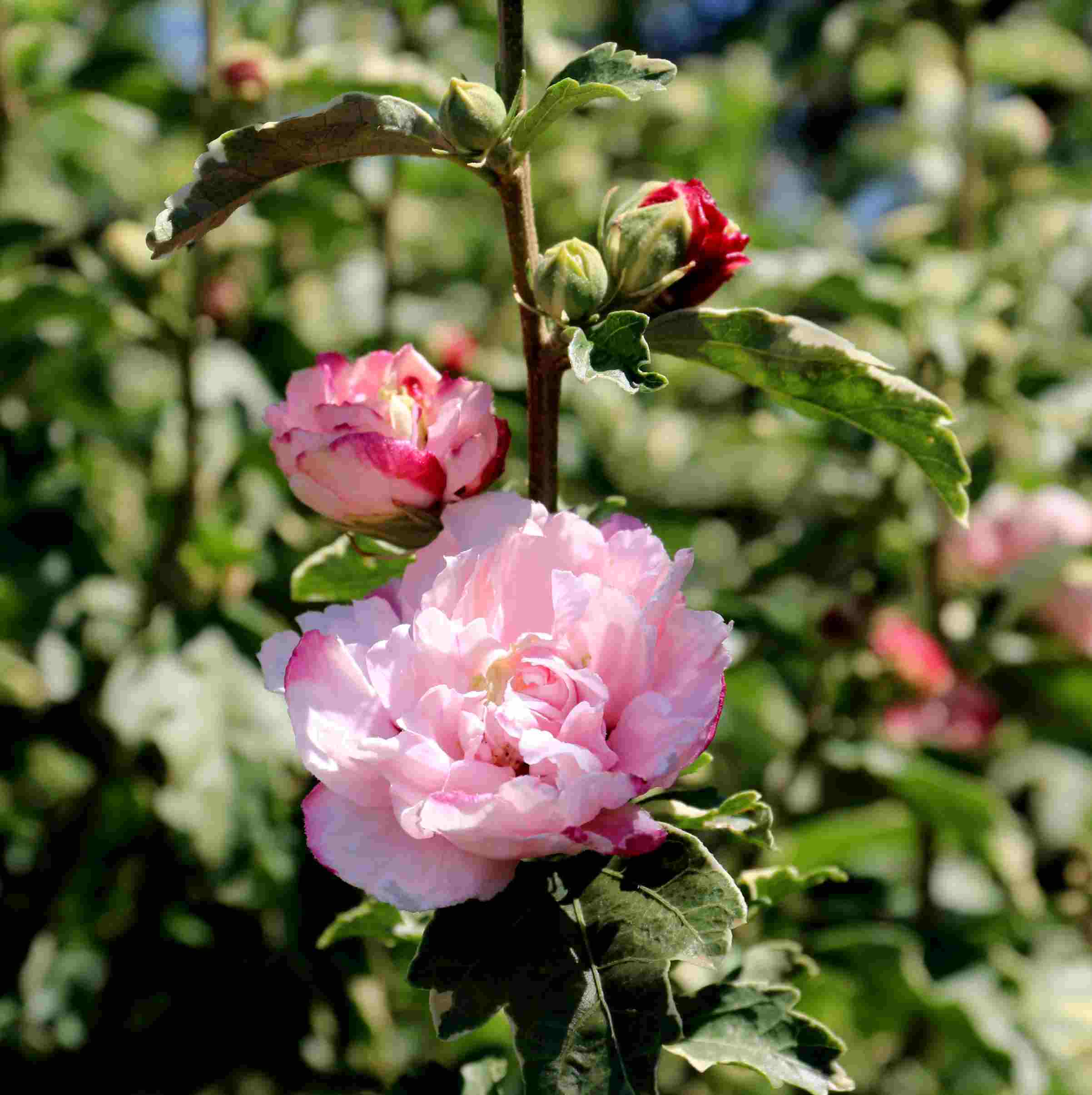 A unique hardy hibiscus with brightly variegated creamy-white and bluish-green foliage. The summer flowers are clear soft pink and double. It is a sterile cultivar that does not produce seeds. It prefers full sun to partial shade, and tolerates poor soils and some drought. It is very tolerant of summer heat and humidity. Prune to shape in spring.