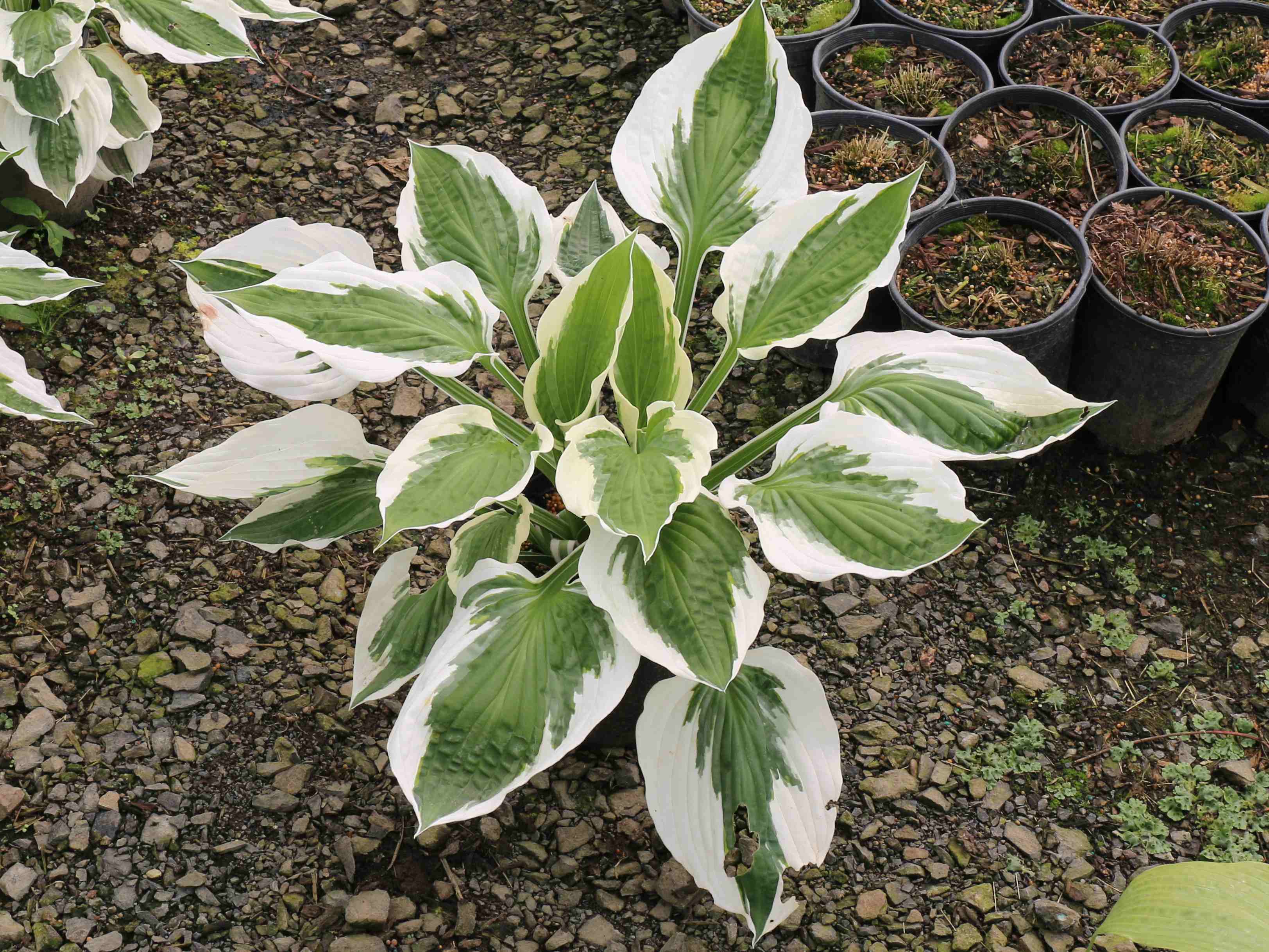 A compact, heat tolerant Hosta with dark green leaves with bright, wavy white edges. Blooms with lavender flower spikes in summer. It prefers full to part shade and moist soil.