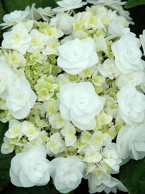 A compact, rounded shrub with showy, double sterile florets that droop from long peduncles arranged around a center of much smaller double white florets. The effect is of a very lacy lacecap flower. The early spring flowers are produced on wood from the previous season, and with regular deadheading, new flowers will appear later in the summer. It needs moist soil and partial shade. PP 21,052.