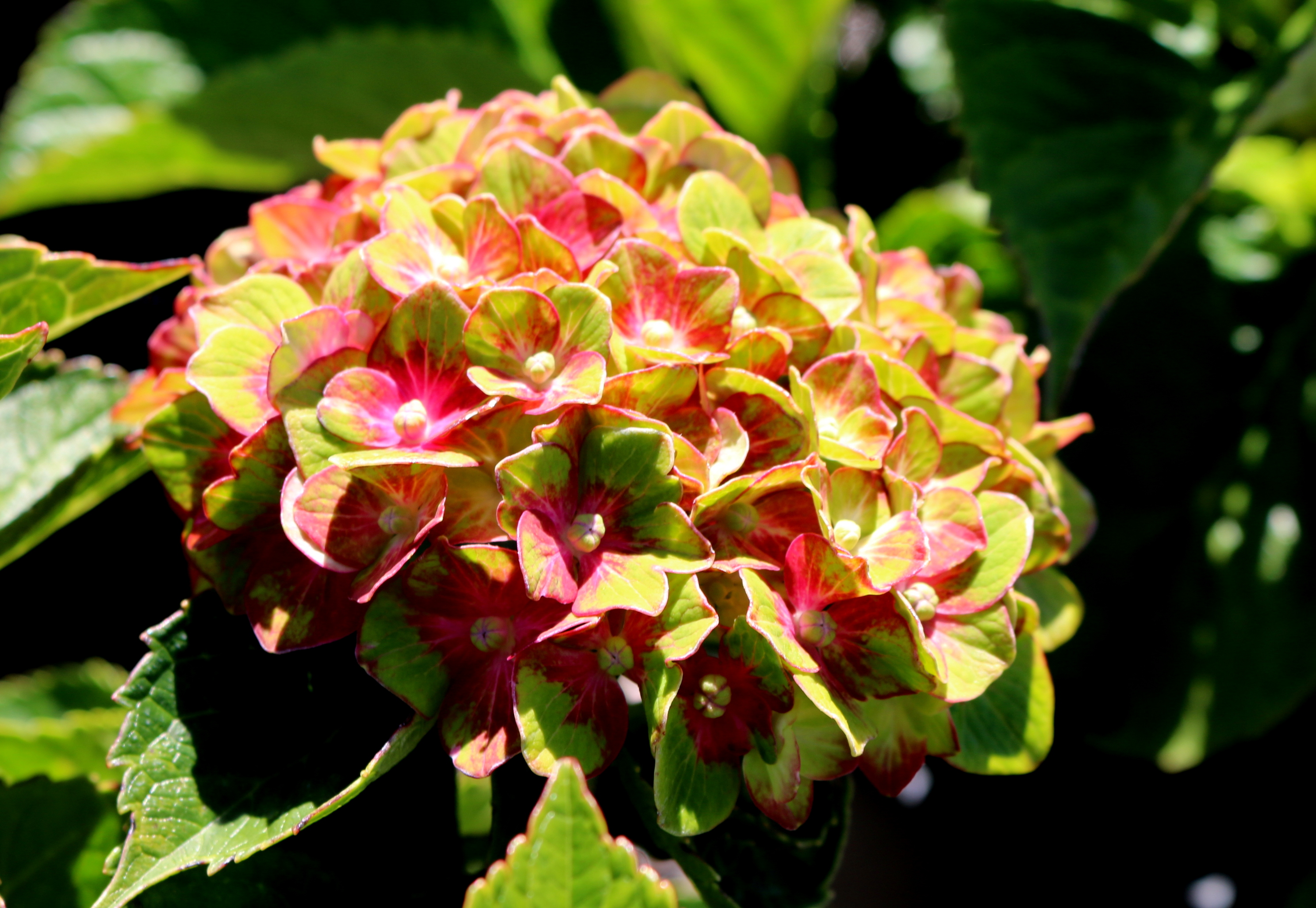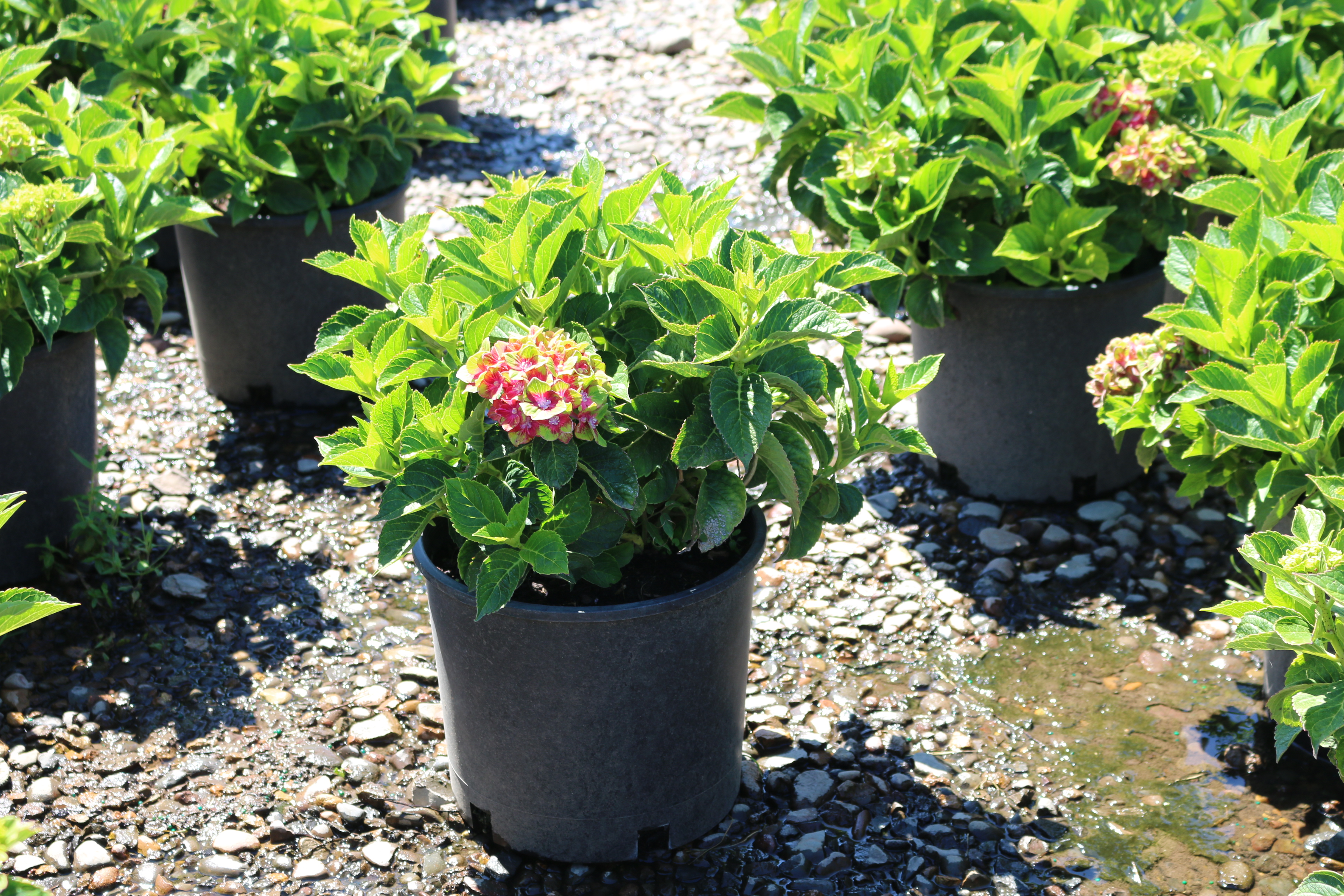 A compact, mounded shrub with deep green foliage. Mophead flower clusters are a unique combination of scarlet-red tinged with green and a blue eye. Blooms appear in late spring and will rebloom again in early fall with the removal of spent flowers. It prefers partial sun and moist soil. A Ball Ornamentals introduction. PPAF.