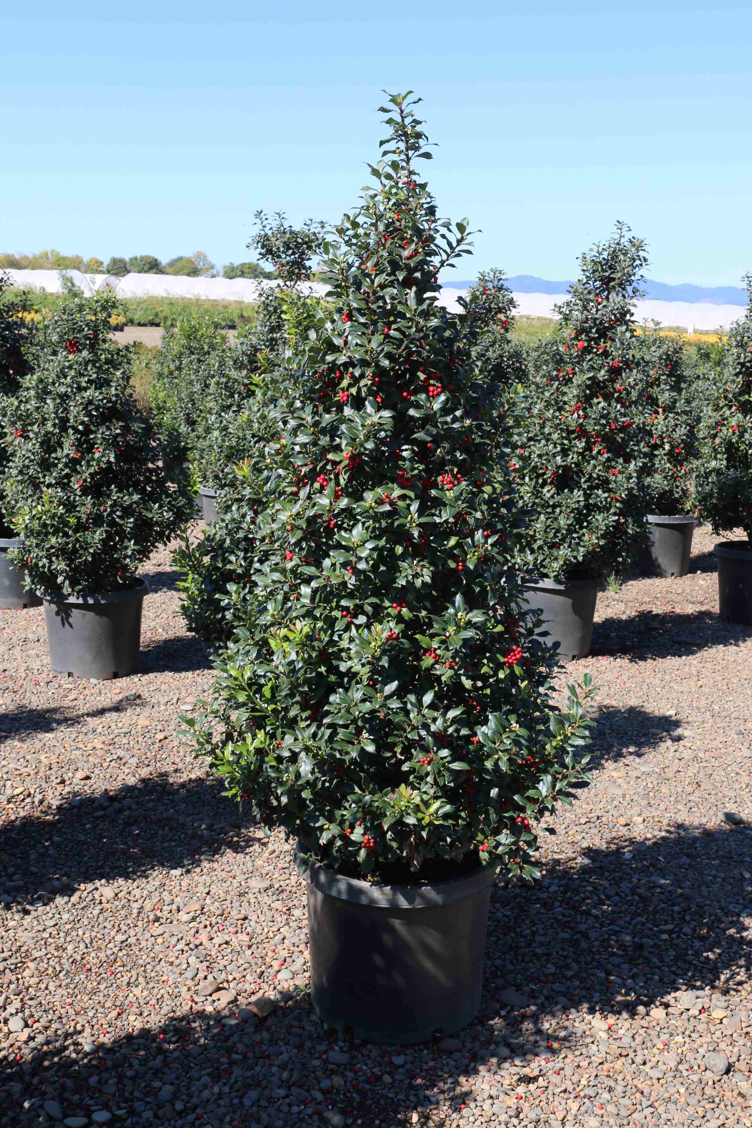 A naturally pyramidal, mite resistant holly with deep green, glossy, foliage. Bears a heavy crop of bright red, long lasting berries, when planted near a male holly. Insignificant white flowers. Easily grown in average, well-drained soil in full sun to part shade. Introduced in 1999 by The Conard-Pyle Company. PP 10,750.
