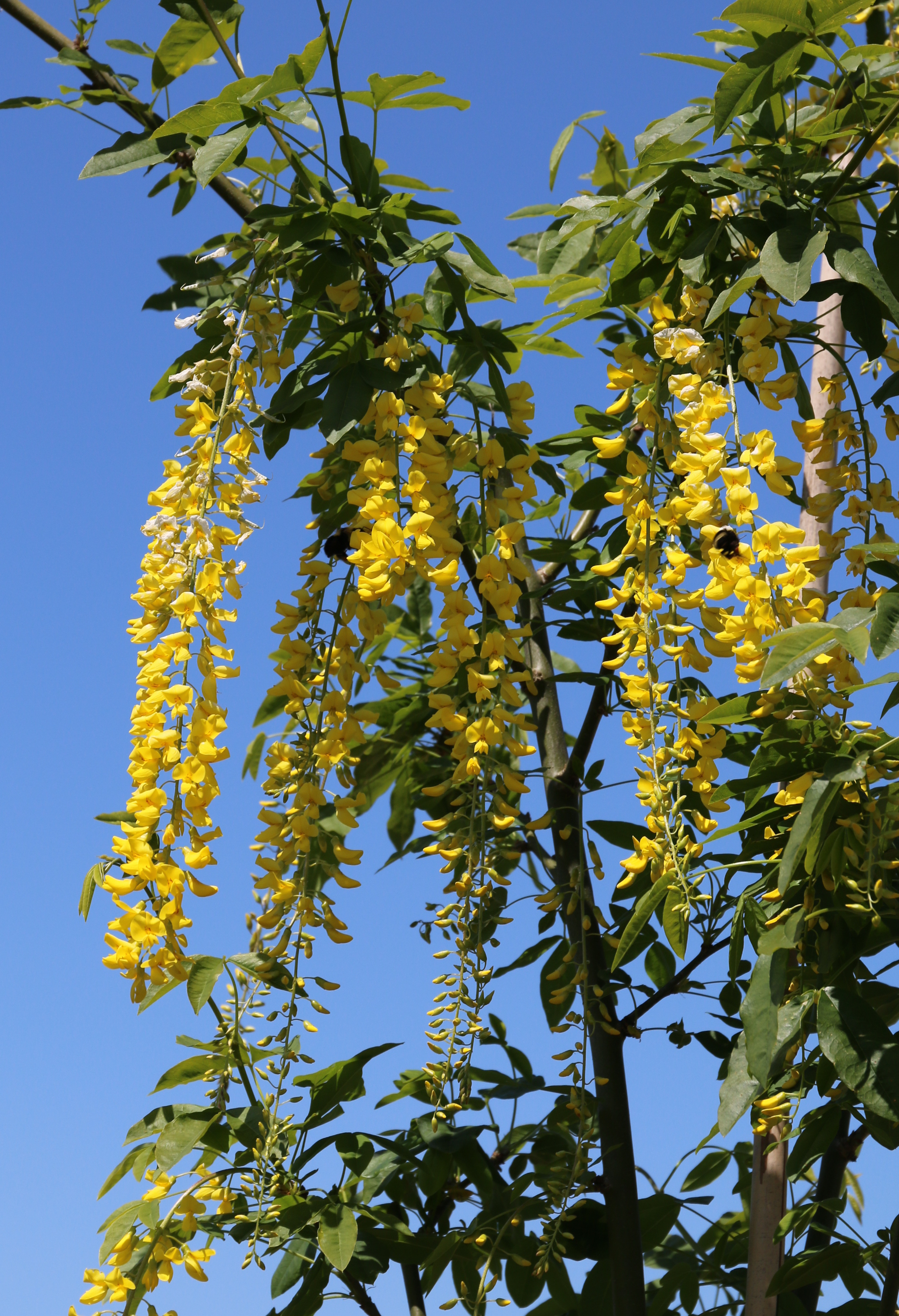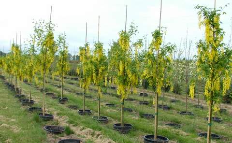 A small, oval tree with bright green foliage. The fragrant, showy blooms are bright yellow and are borne on 10" long pendulous racemes in the spring. Prefers full sun to part shade in a rich, medium moisture, well-drained soil. Use as a small shade tree. It may be trained along an arbor or pergola.