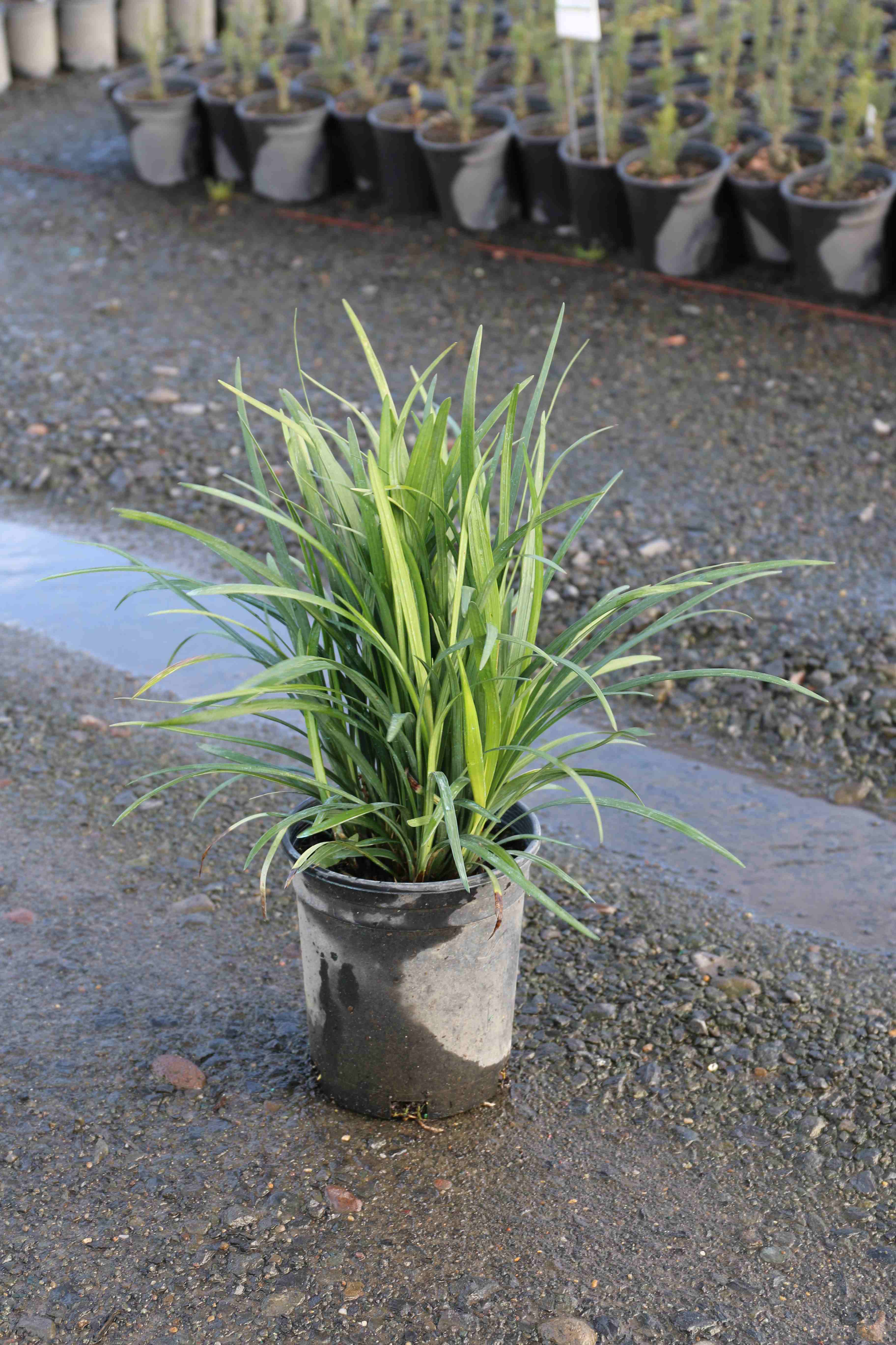 It is an evergreen perennial with arching, grass like foliage. It blooms in the summer with spikes of blue flowers that are followed by black berries. It prefers moist soils, however, it will take drought once established. It does well in shade to full sun. Use as an edging plant or massed as a ground cover.