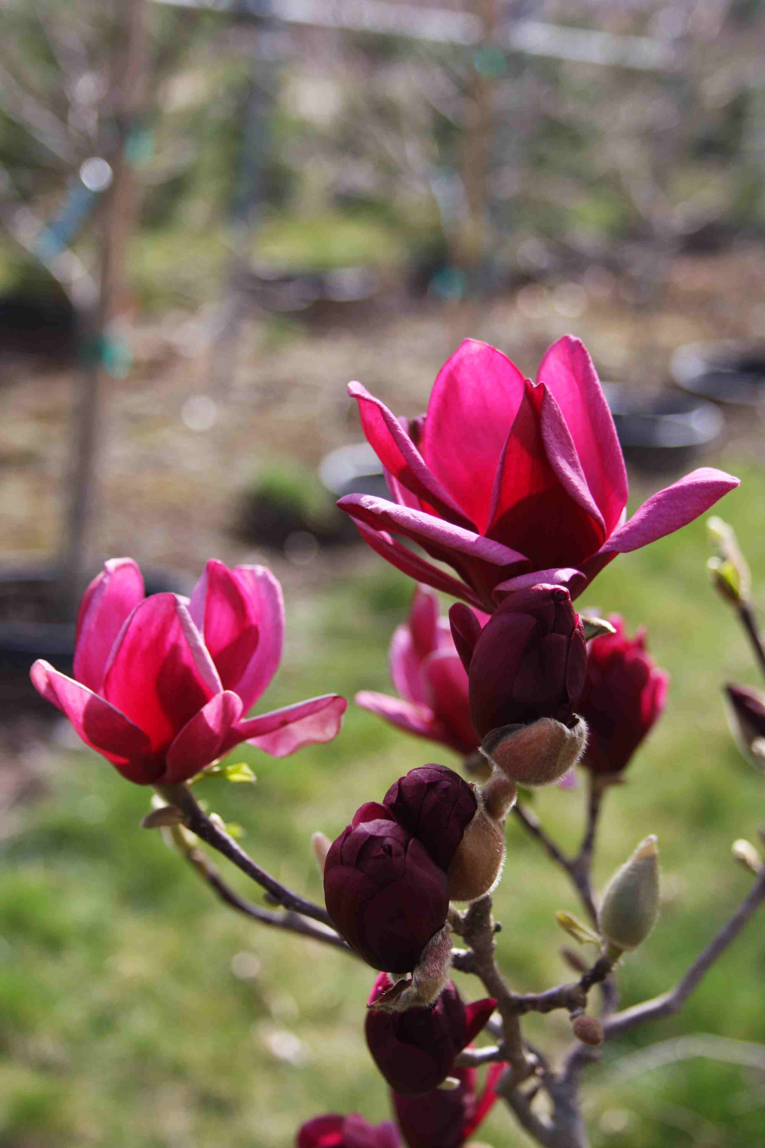A compact, upright tree with lightly scented flowers in early spring through early summer. Beautiful black-red buds open to small globular tulip-shaped blooms of rich maroon-purple. It lives up to it's name granting the three wishes of color, fragrance, and form. It prefers full sun in rich, well-drained soils.