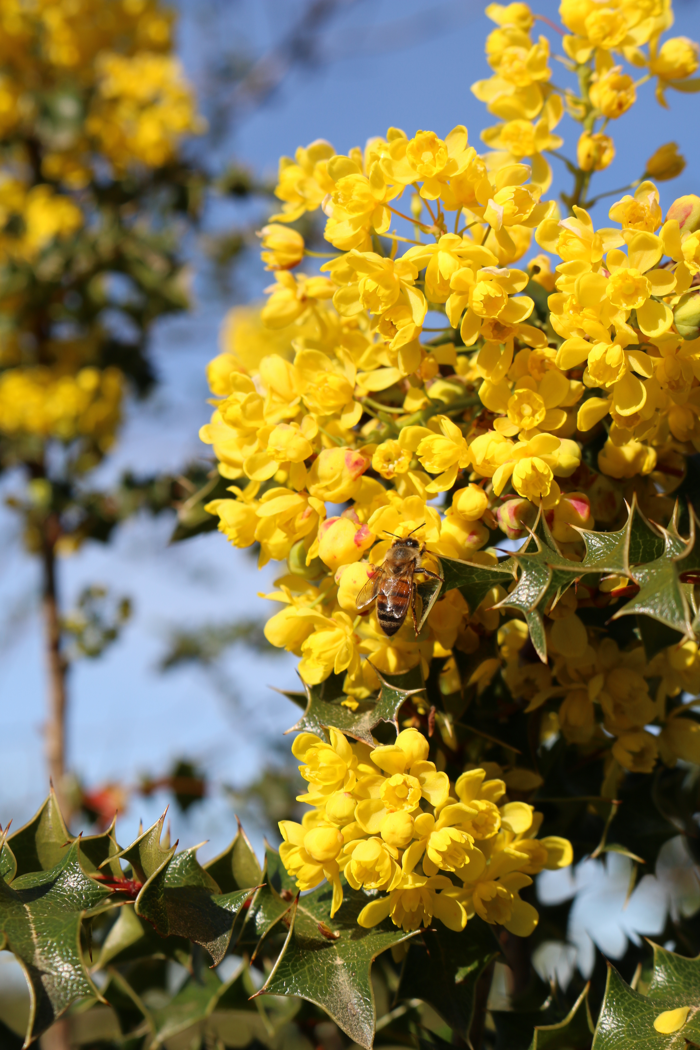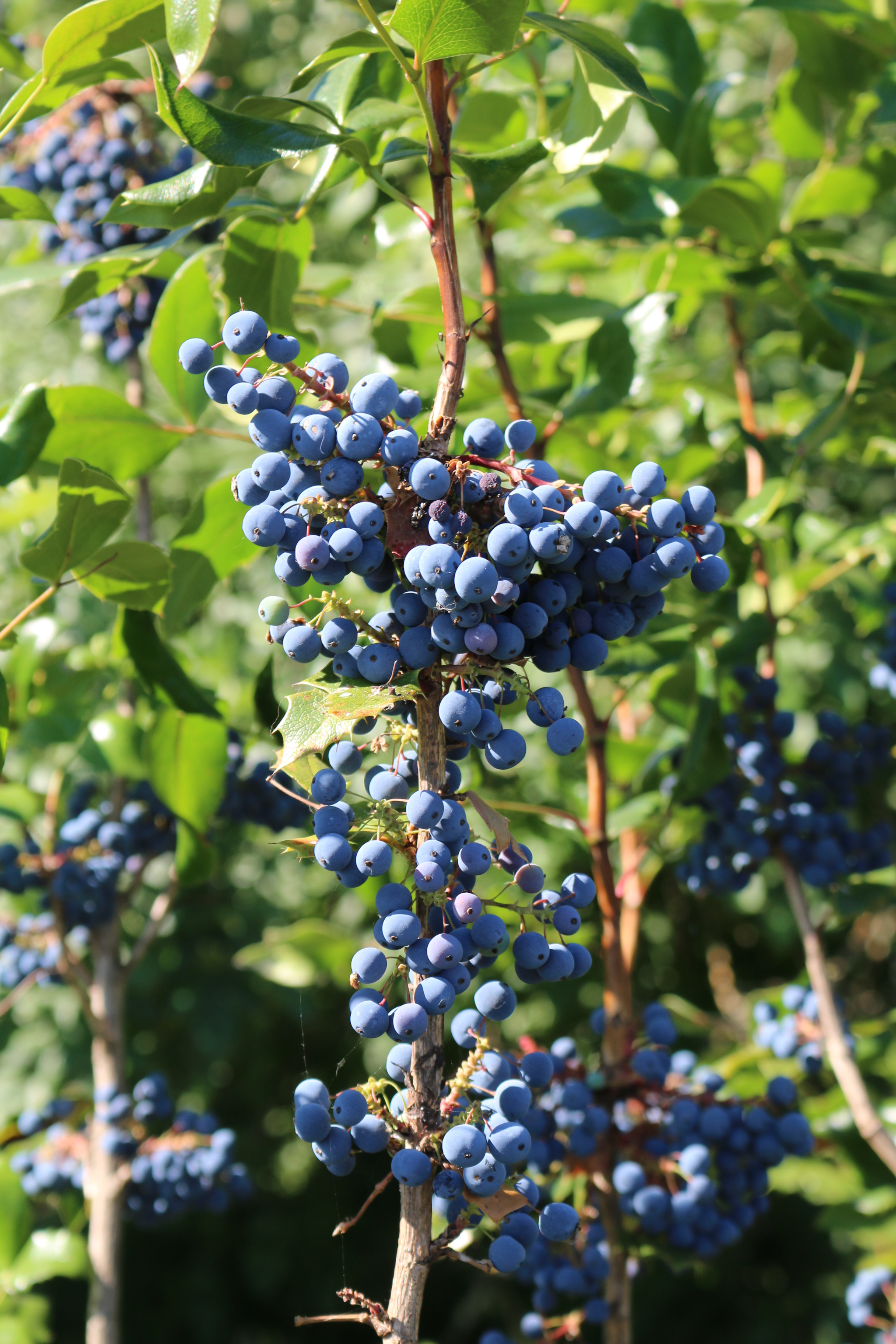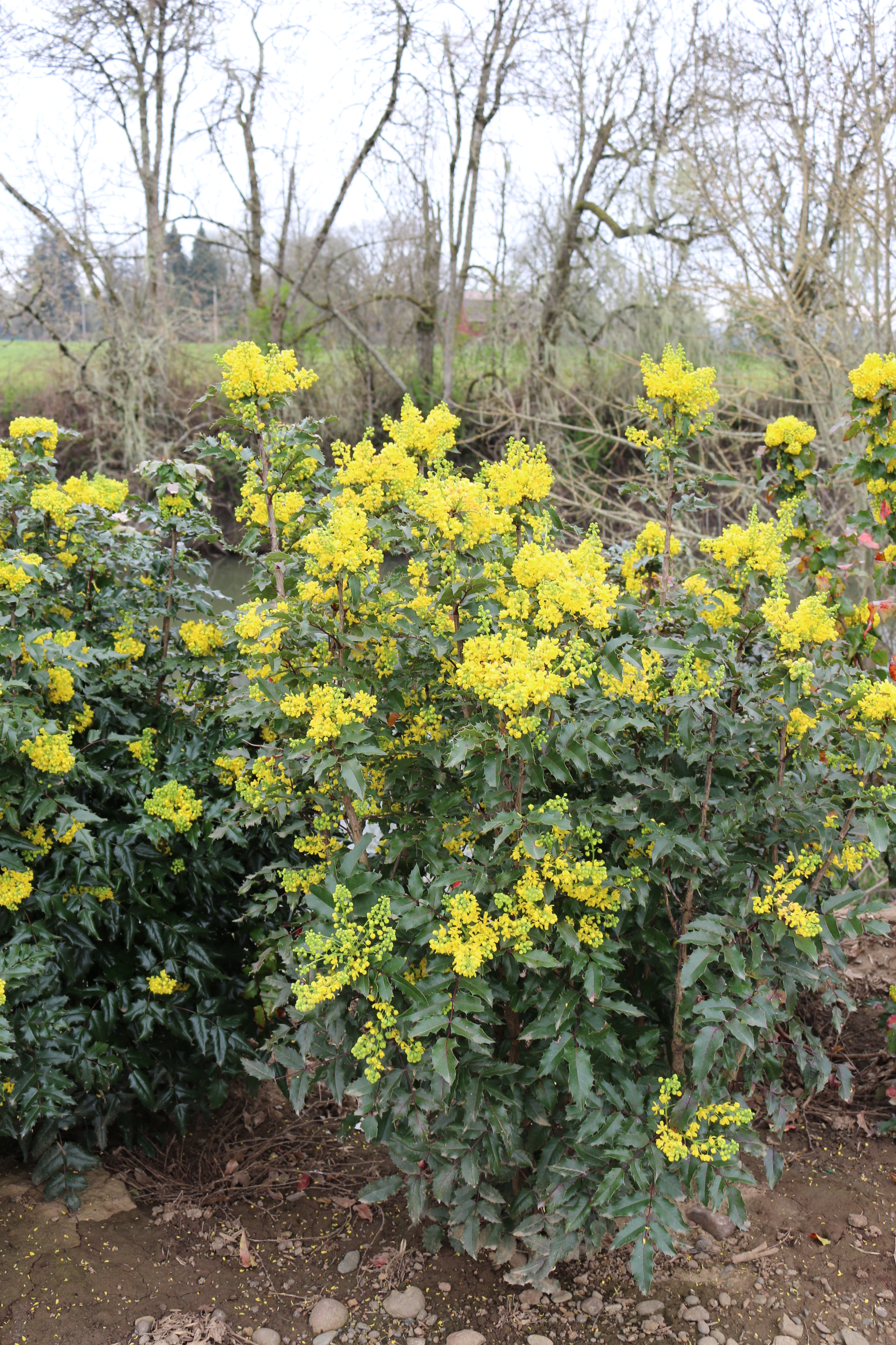 An upright, irregular, suckering shrub. The spiny foliage is a lustrous, dark green. It blooms in the spring with 3" long racemes of bright yellow flowers. The fruit is dark blue, almost like small grapes. It is sour, but safe to eat. Grow in full sun to part shade in moist, organically rich, well-drained soil. It responds well to hard pruning. This is the state flower of Oregon.