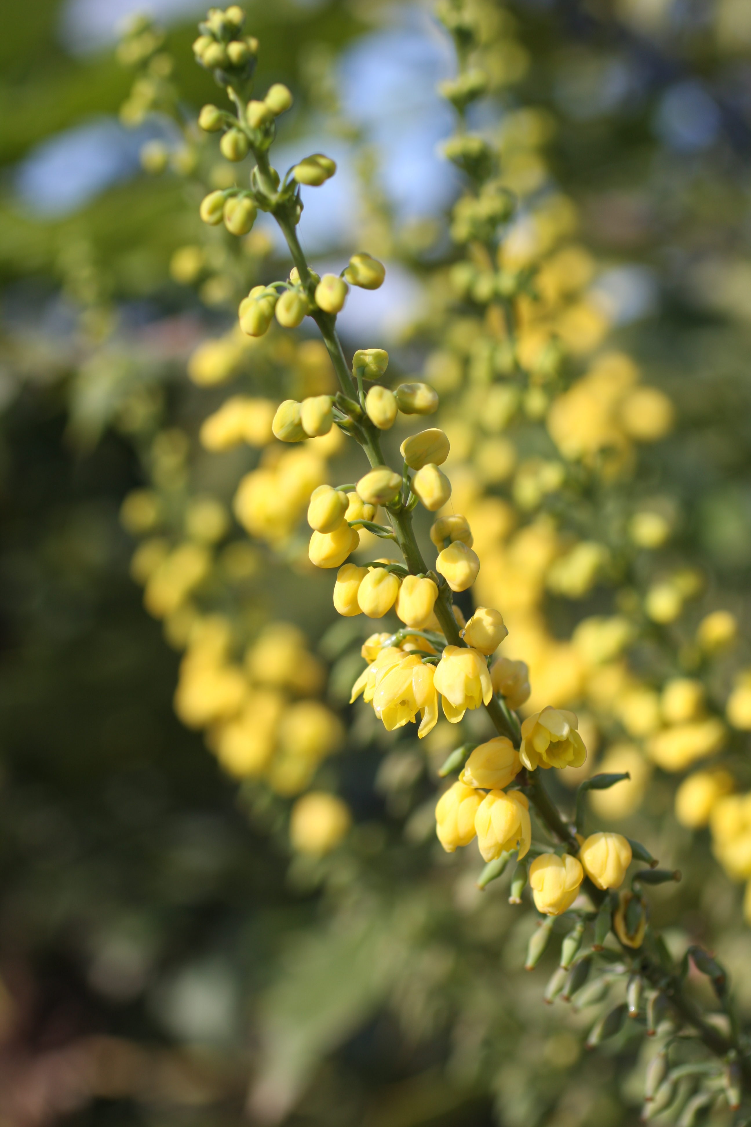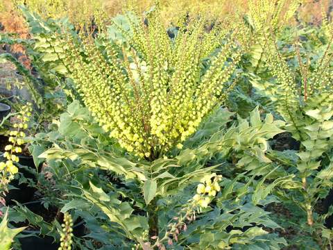 An upright, vase-shaped shrub with large sprays of bright yellow, winter flowers. The late summer berries are dark blue. It is disease resistant. Has large dark green spiny leaves and is bold and symmetrical in form. Grows best in part shade and normal to moist soils.
