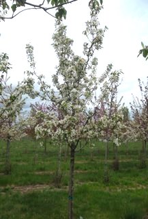 A spreading, rounded tree with glossy, clean foliage. The crimson to pink buds open to large, single white flowers. The small, bright red fruit persists into winter. It has good disease resistance. It prefers full sun and moist well-drained soils. Discovered as a seedling in Arnold Arboretum about 1950. It was named to honor Donald Wyman, Horticulturist there for 35 years.
