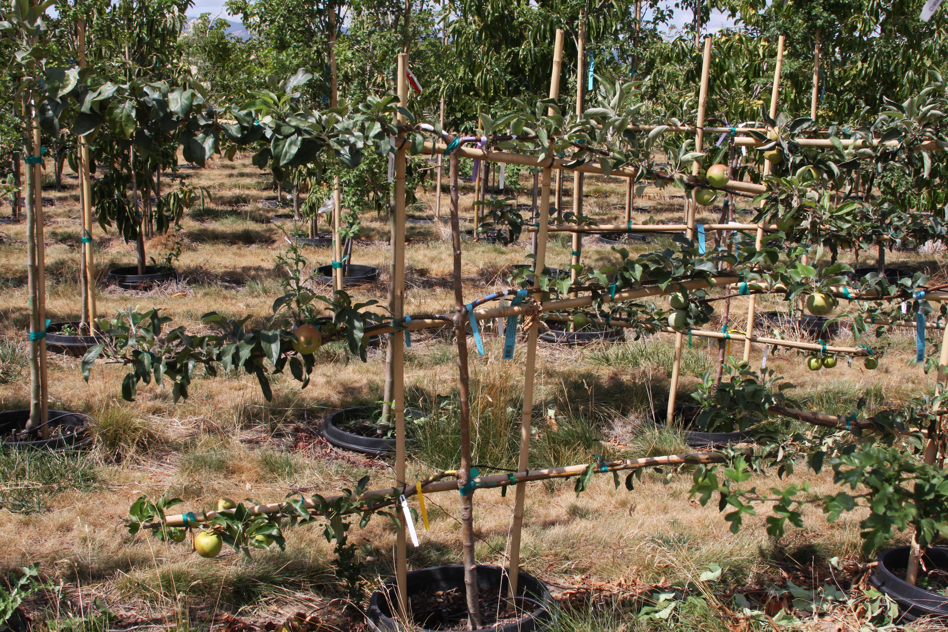Six varieties of fruiting apples trained in a horizontal espalier. The varieties are: Braeburn, Honeycrisp, Fuji, Gala, Granny Smith, and Golden Delicious. It may be planted against a wall or fence, or otherwise supported into a fruiting fence. It needs full sun to part shade, a well-drained soil, and regular pruning to maintain form and increase fruit production. Grown on semi-dwarf rootstock.