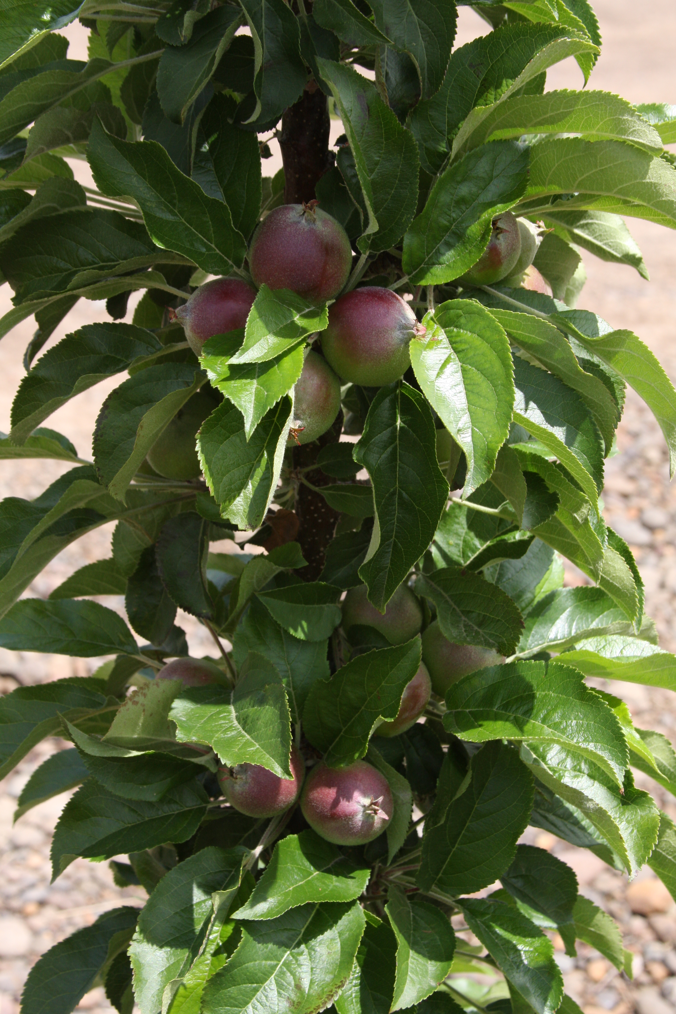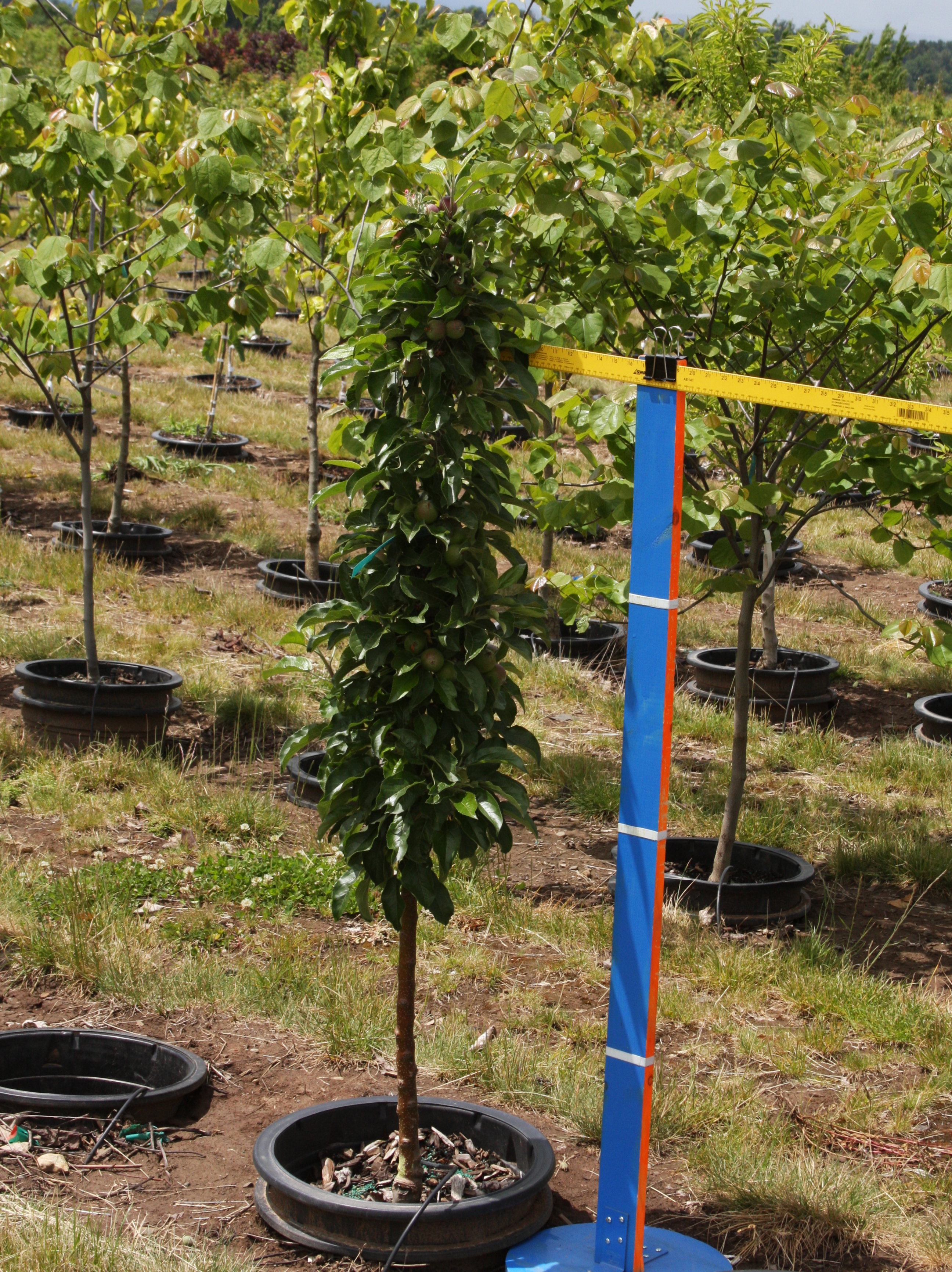 A tightly columnar apple with white flowers in the spring, followed by large, firm golden apples in September. The crisp, juicy fruit is good fresh or baked. Needs a pollinizer. It needs full sun and a well-drained soil. Budded on semi-dwarf rootstock.