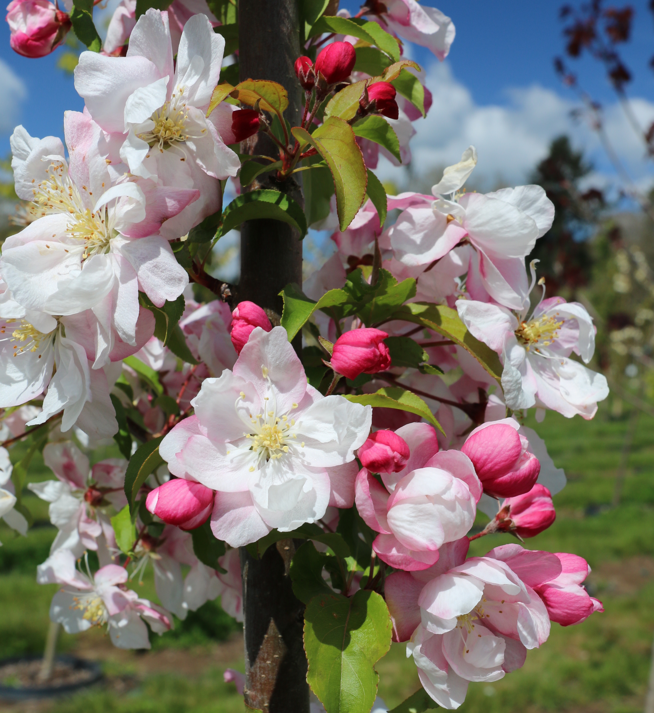 A stiffly upright tree, that is sparsely branched when young. The dark pink buds open to large, double white flowers. It is fruitless and has good disease resistance. It will grow best in full sun in a moist, well-drained soil. Introduced by Marvin Jarmin, it was discovered near Puyallup, WA in his garden circa 1982. PP 14,337.