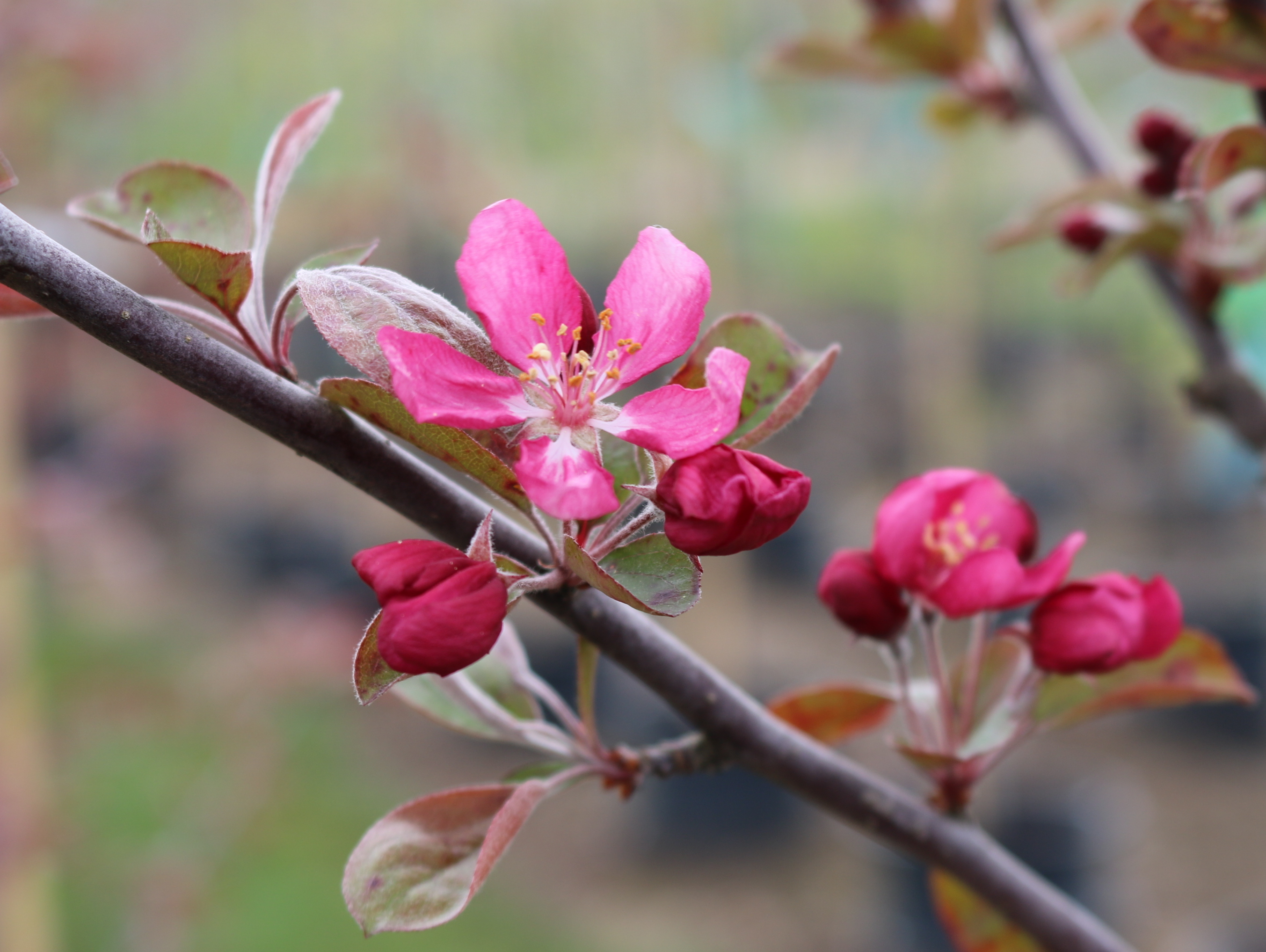 A fast growing rounded tree with an upright, equal spread. The foliage is bronze green. The deep pink flowers are followed by red fruit. Disease resistance is good to excellent. It will grow best in full sun and a well-drained soil.