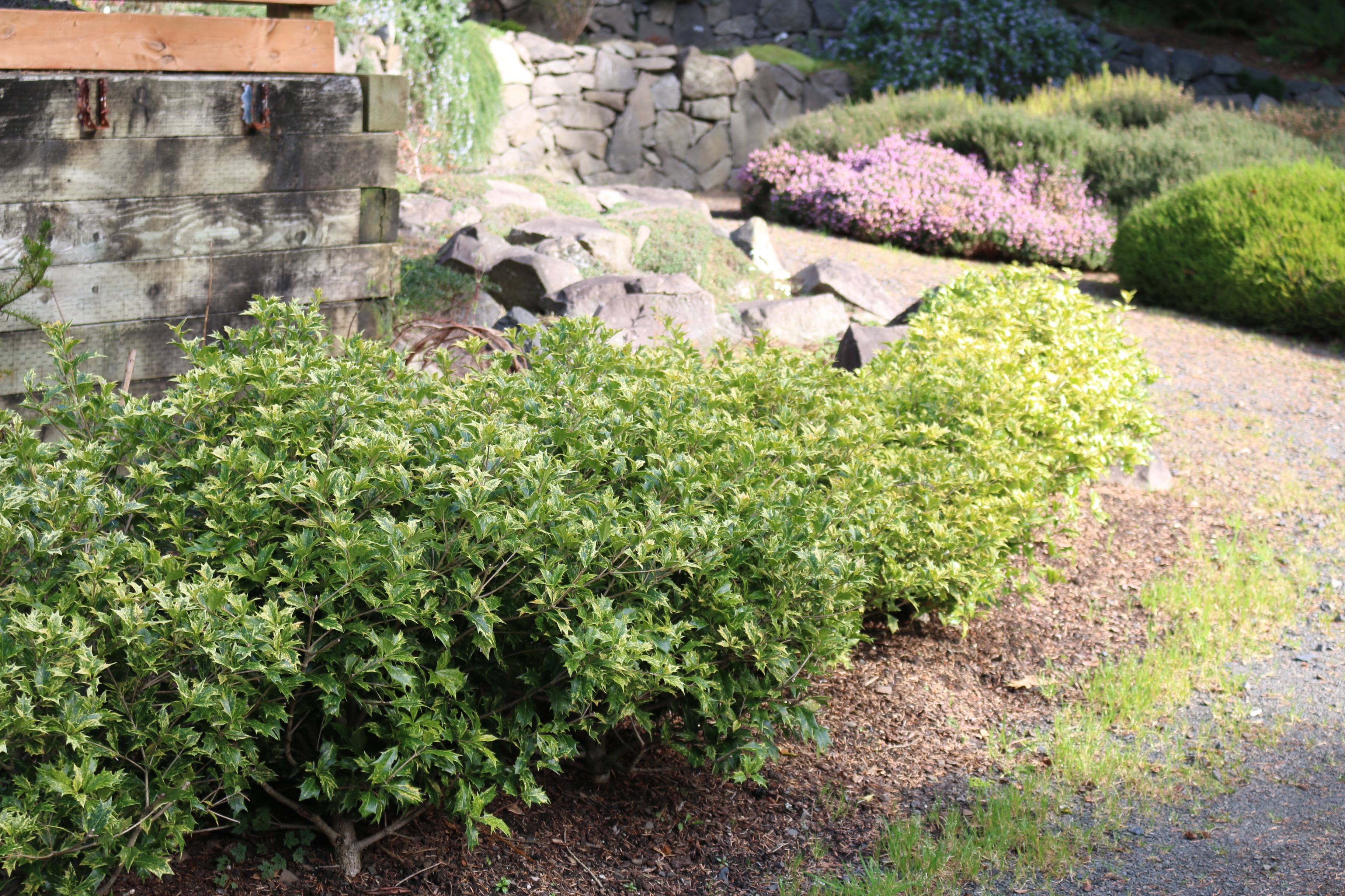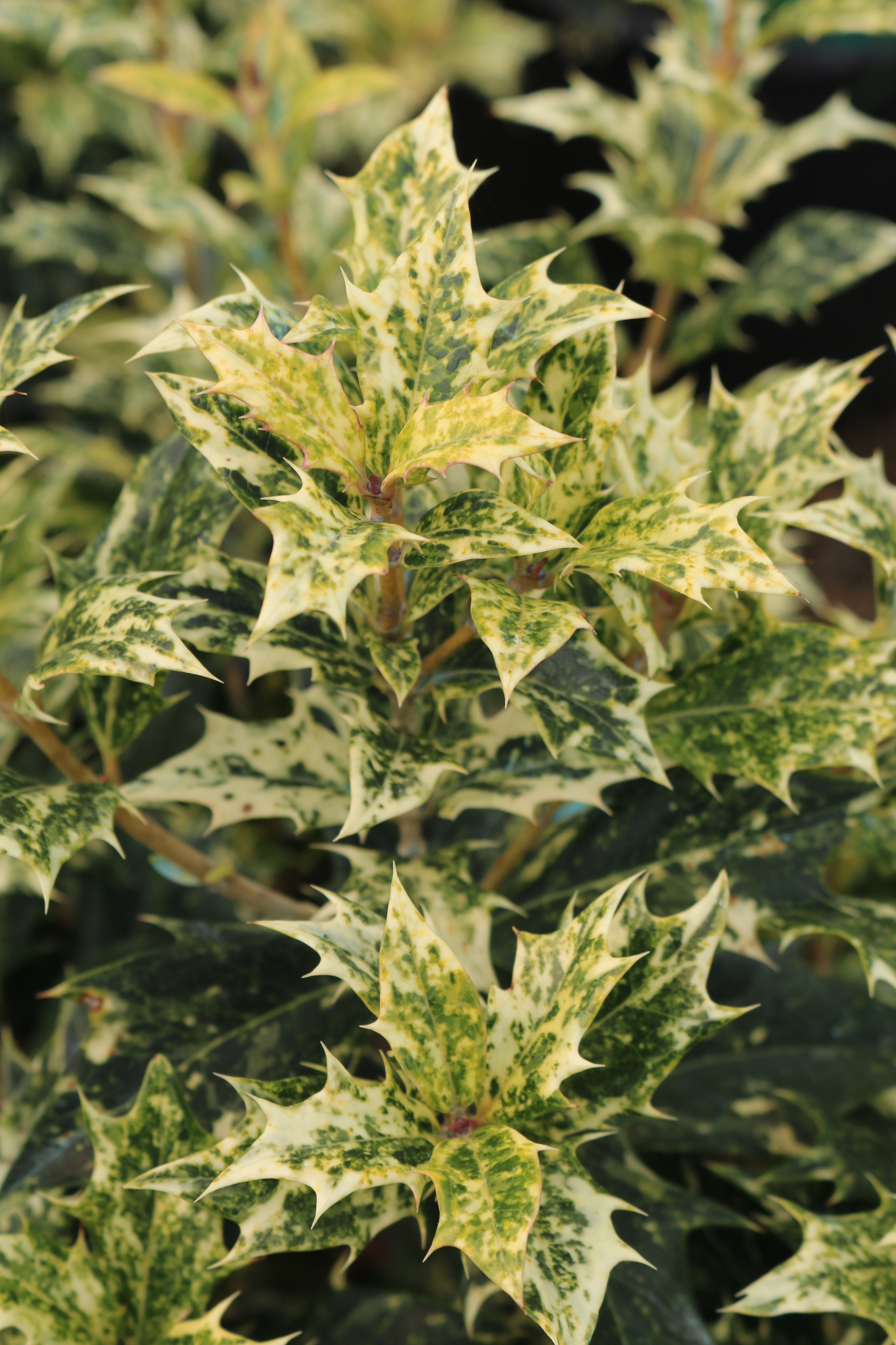 A dense rounded shrub with spiny, glossy dark green leaves that are speckled with gold and cream. The new growth is pink to bronze tinged. 'Goshiki' is Japanese for 'five colors' or 'variegated colors' which aptly describes this plant. Makes an excellent screen or barrier planting. Plant in full sun to part shade in average soil that is well-drained. Prune lightly if needed.