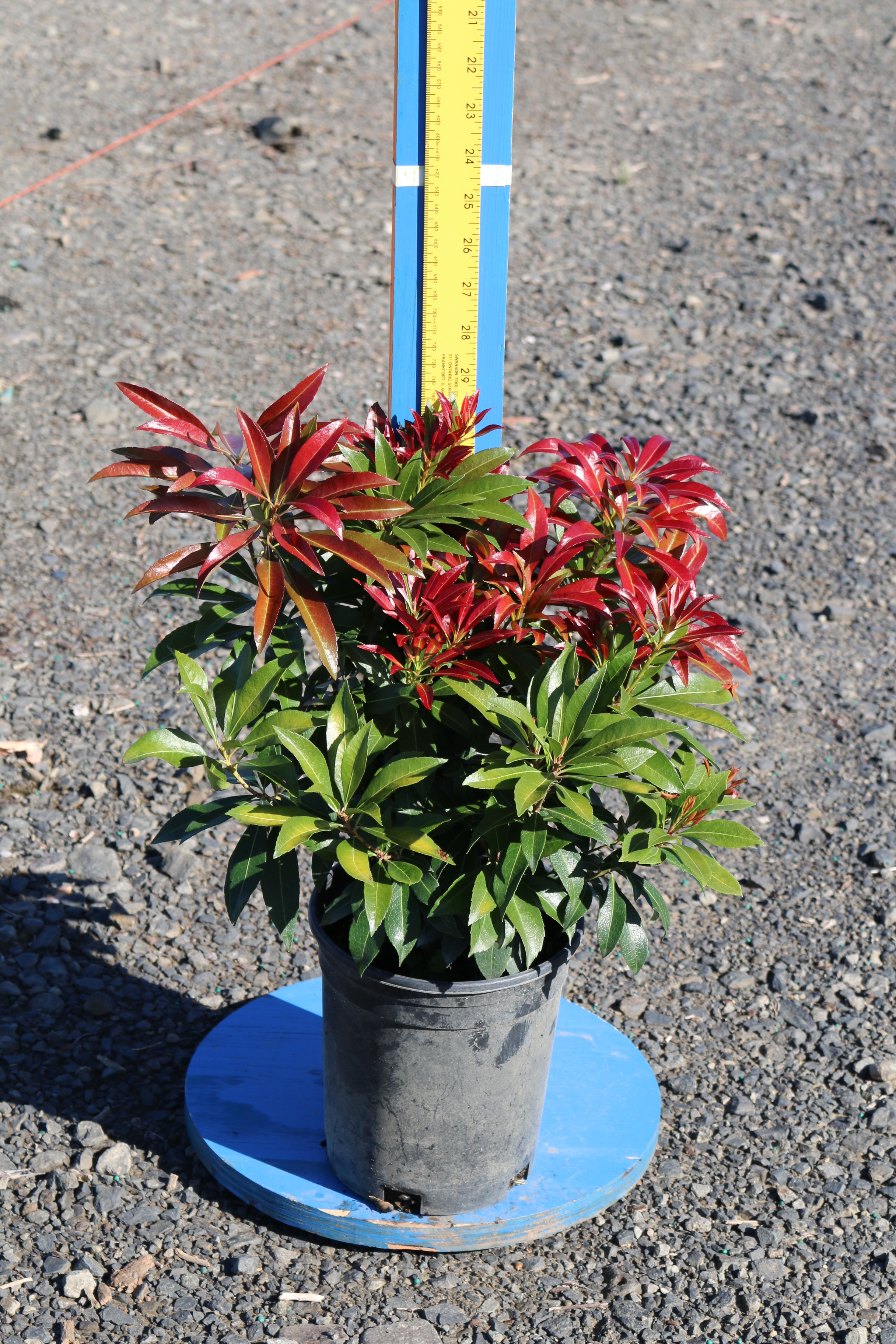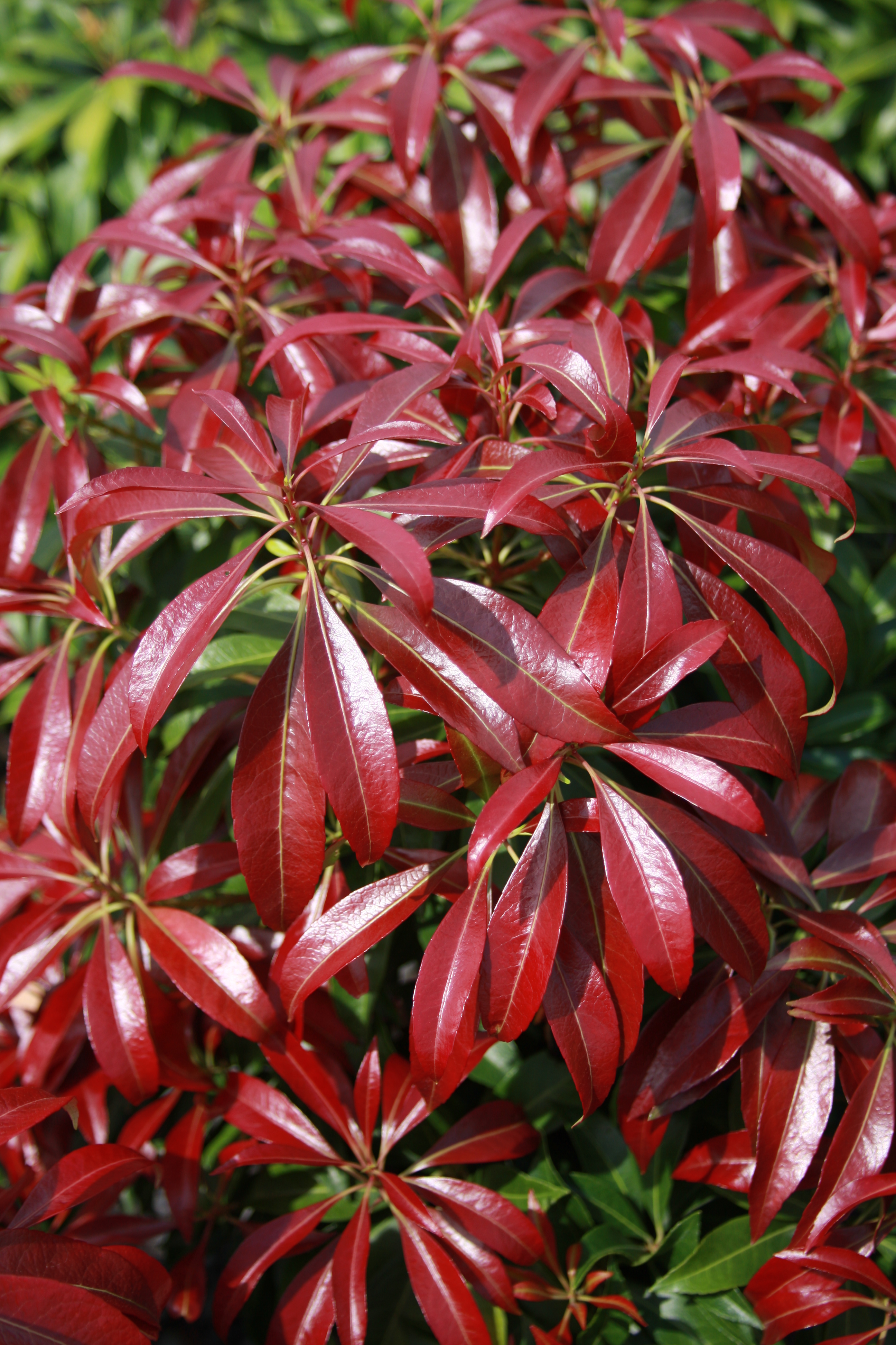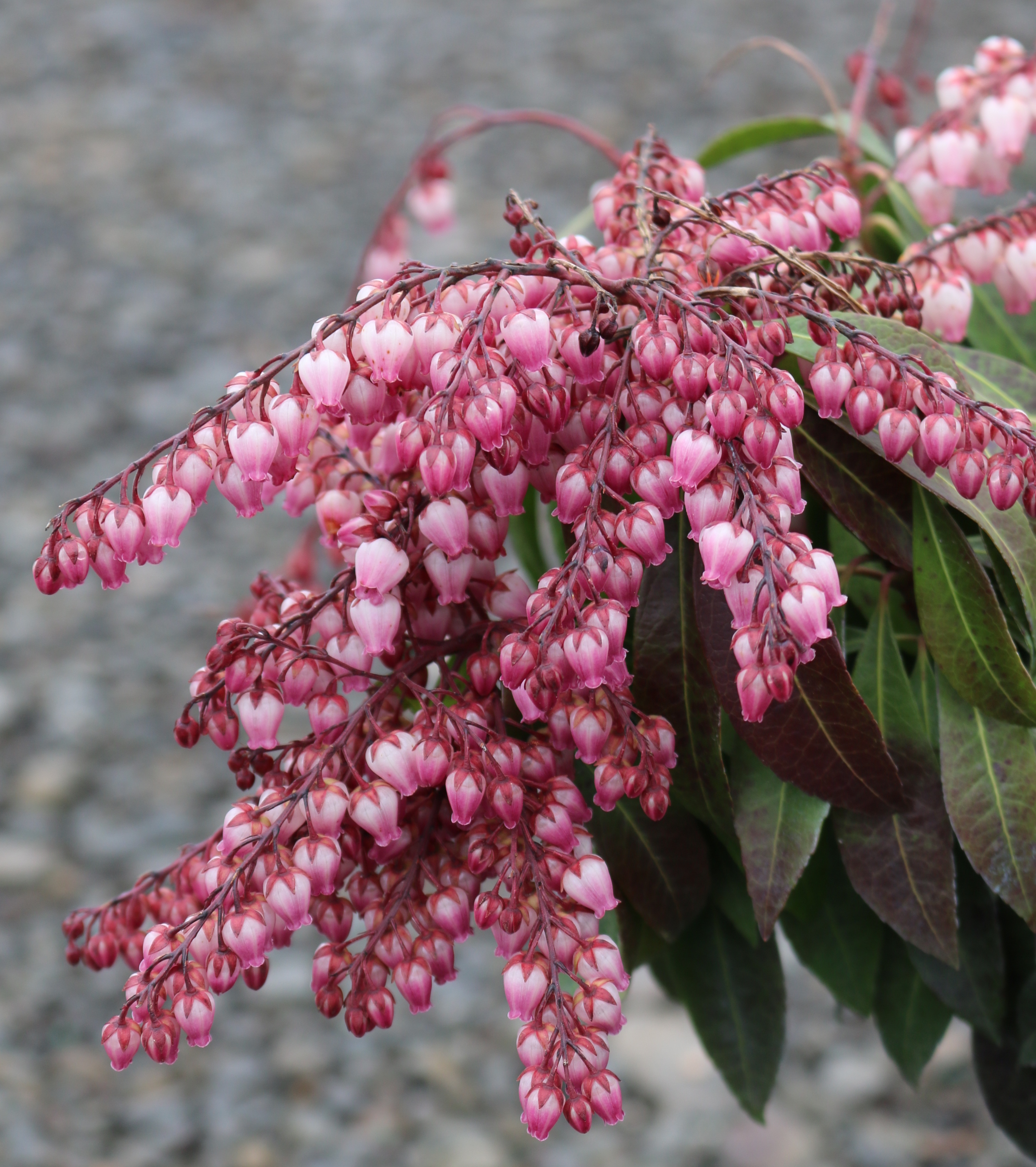 A rounded shrub with large glossy foliage that is a striking wine red when young. The leaves age to dark green. The drooping clusters of early spring flowers are rose-pink. Takes full sun to part shade, but needs cool, moist soil. Use in the shrub border, as an informal hedge, or as a specimen. PP 15,452.