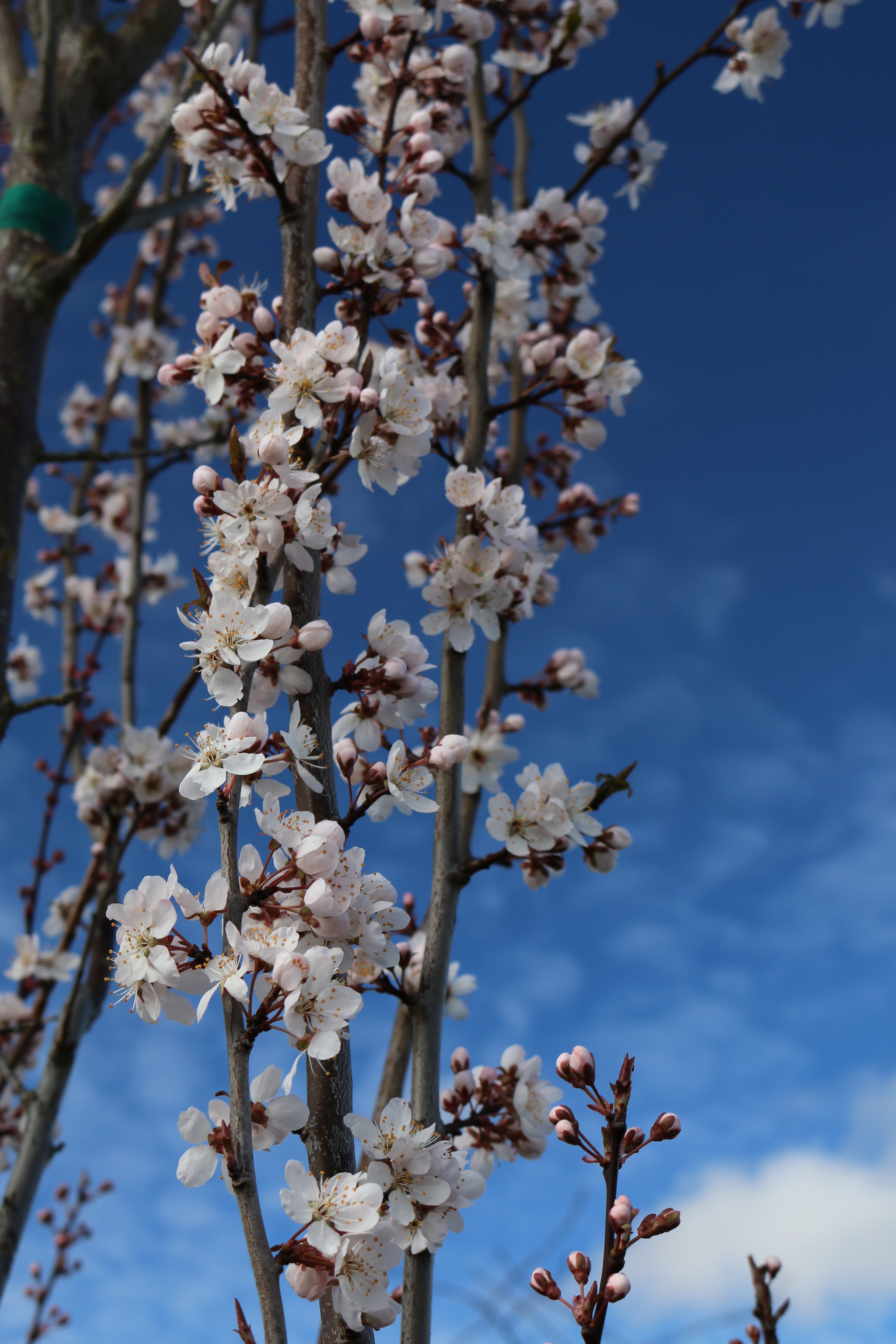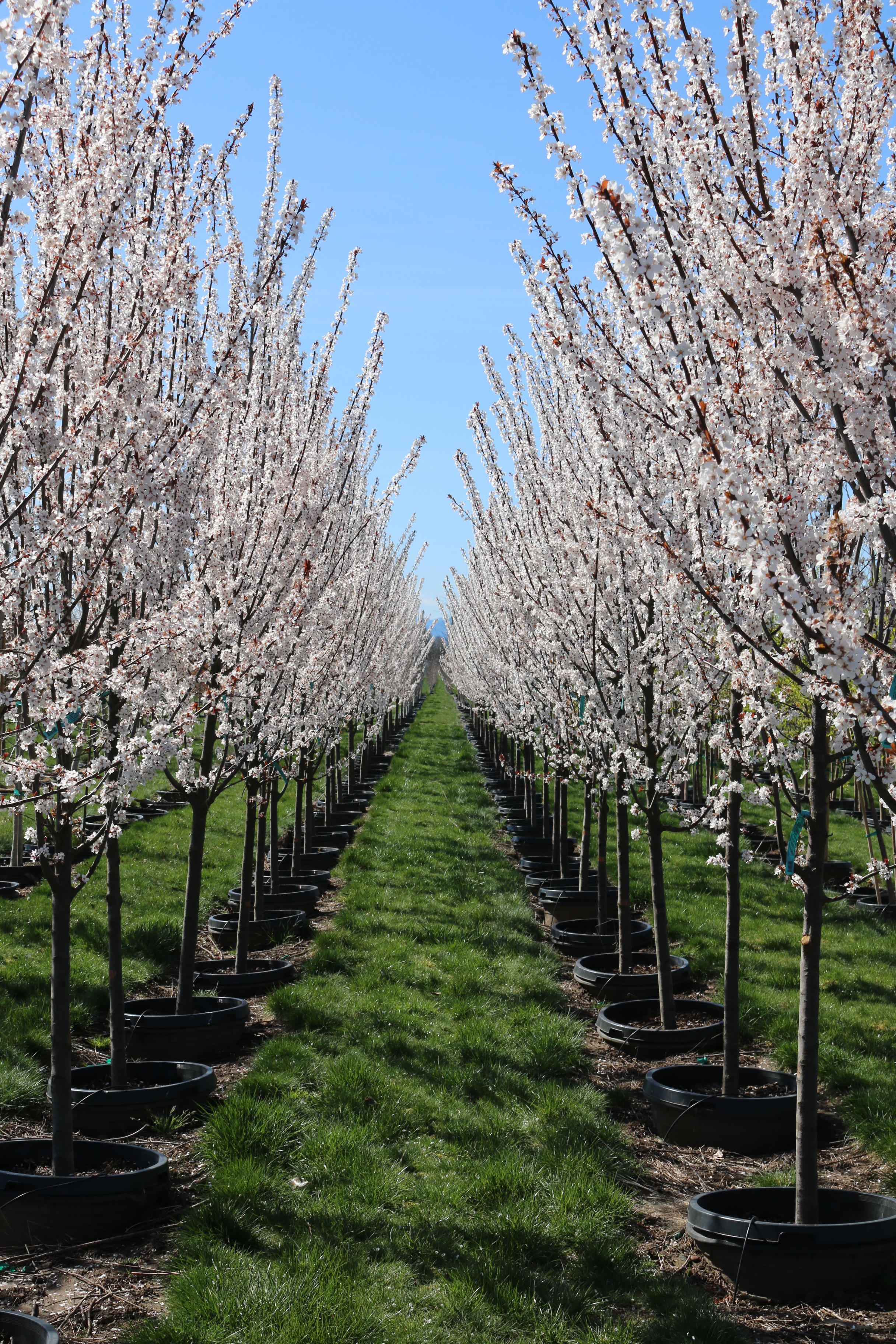 A densely growing columnar tree with rich merlot-purple leaves and white flowers in spring. Cold and heat tolerant with a vigorous growth habit. Excellent as a street tree or a screening hedge. It will grow best in full sun and most soils, as long as they are well-drained. It does better with moderate summer moisture. This is a sport of 'Newport' plum. PP 19,564.