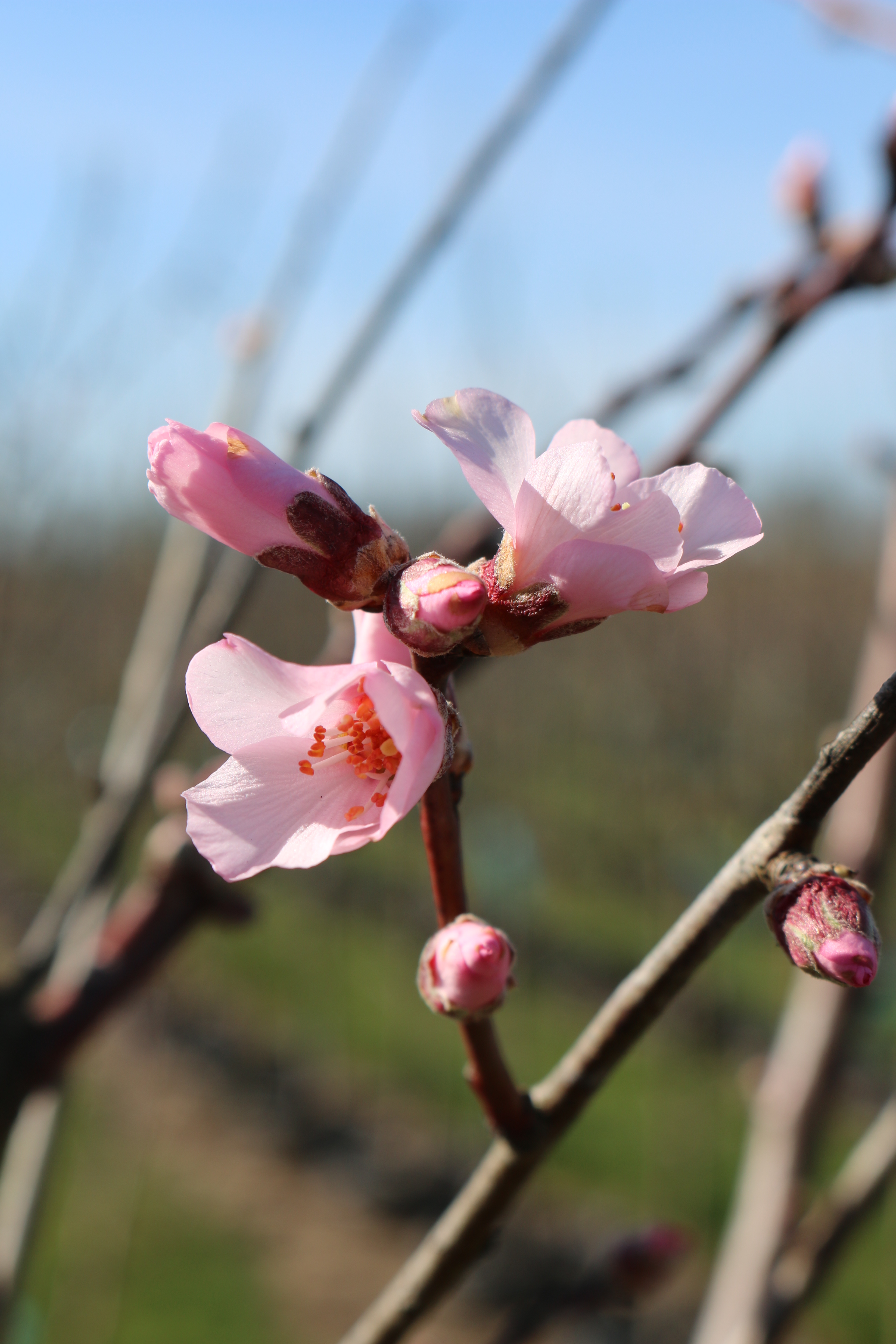 A late blooming, vigorous growing tree. The flowers are profuse, and dark pink. The nut is more bitter than the commercial varieties. It is self-fruitful. (800 hours chilling). Almonds need full sun and a well-drained soil.