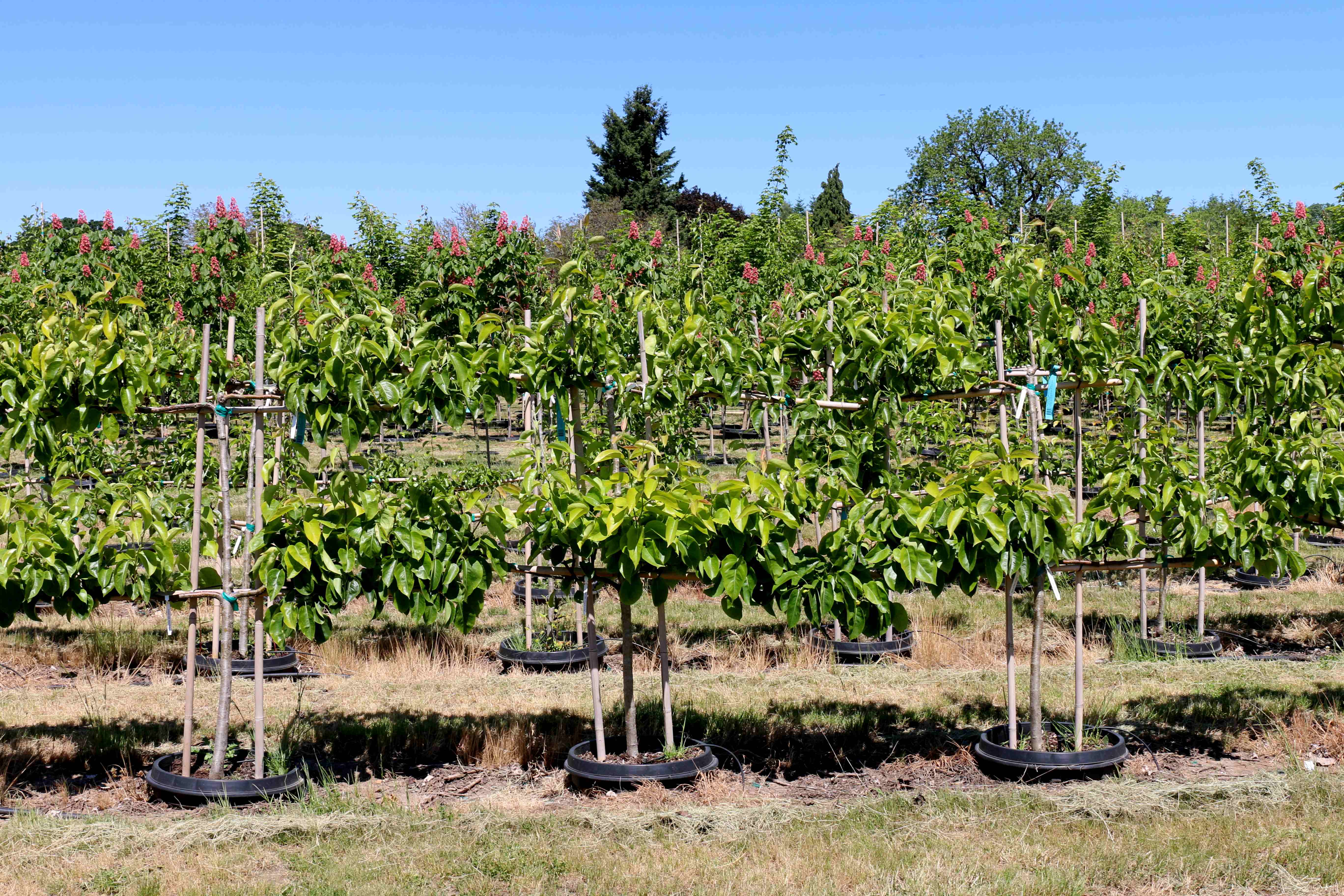 An espaliered fruiting Asian pear with Chojuro, Hosui, Shinseiki and 20th Century Asian pears on one stem. They need full sun and a well-drained soil. Obtain local advice for more cultural information.