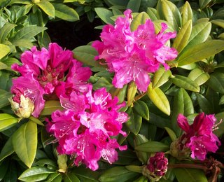 A broadly rounded, compact shrub with glossy, dark green leaves. The mid-season blooms are rose-red with a few darker spots and blotch in the throat. H-2. It prefers partial shade to full sun, and moist, cool, acidic well-drained organic soil. Removal of spent blossoms encourages new growth and future flowers.