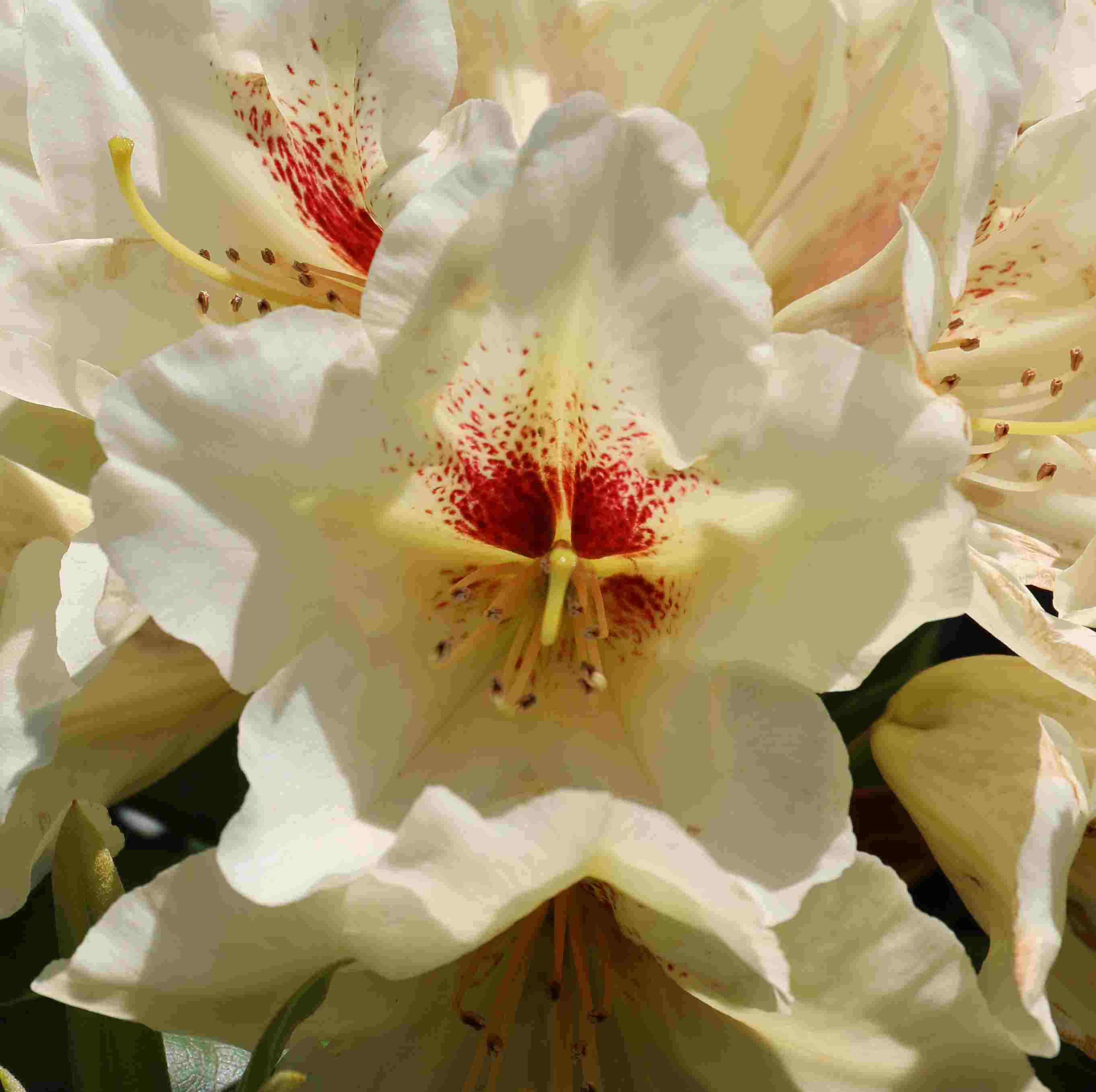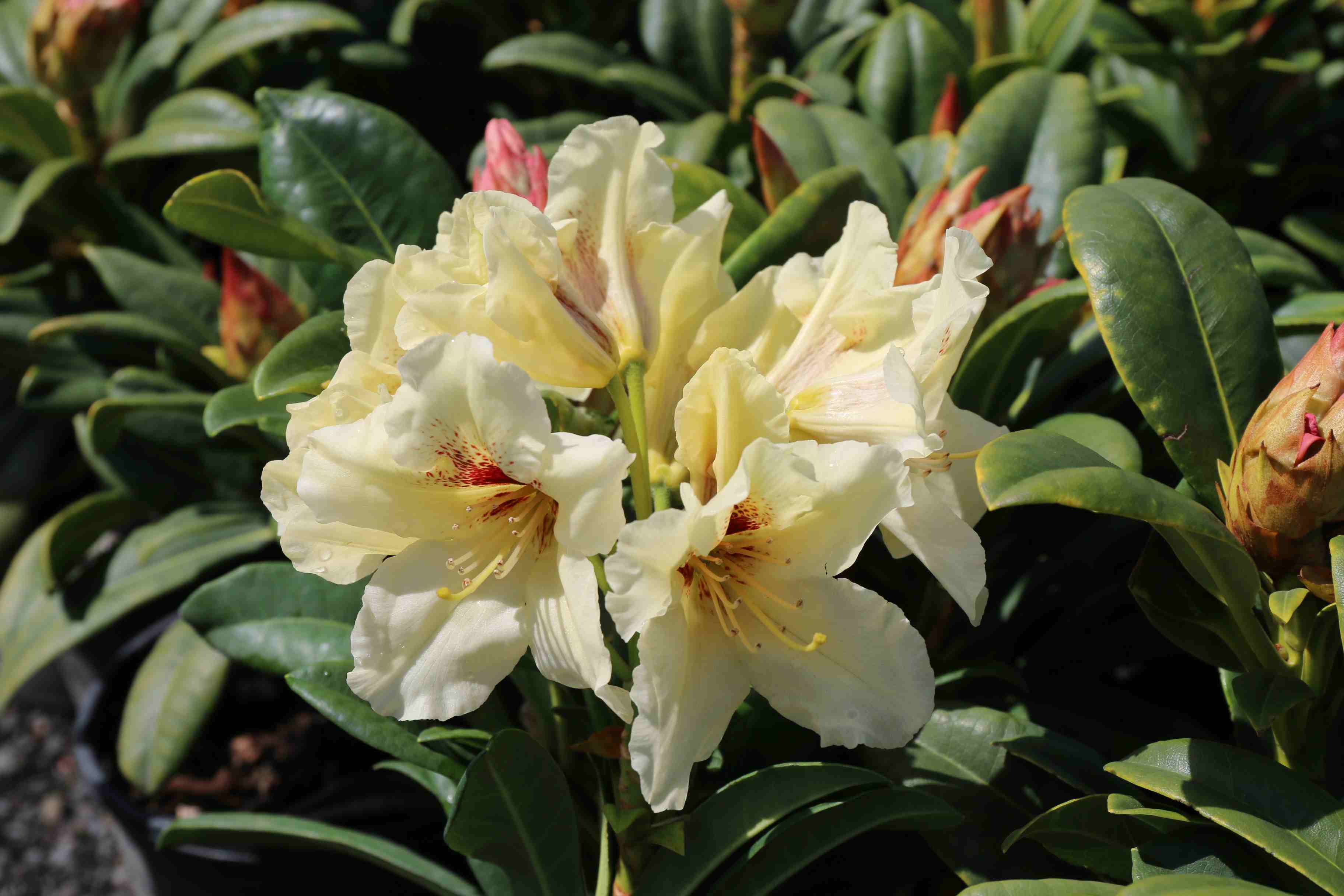 An upright shrub with medium yellow flowers and red blotches that contrast nicely with the dark, evergreen foliage. Very hardy with good resistance to mildew. H-1. It prefers partial shade to full sun, and moist, cool, acidic well-drained organic soil. Removal of spent blossoms encourages new growth and future flowers.