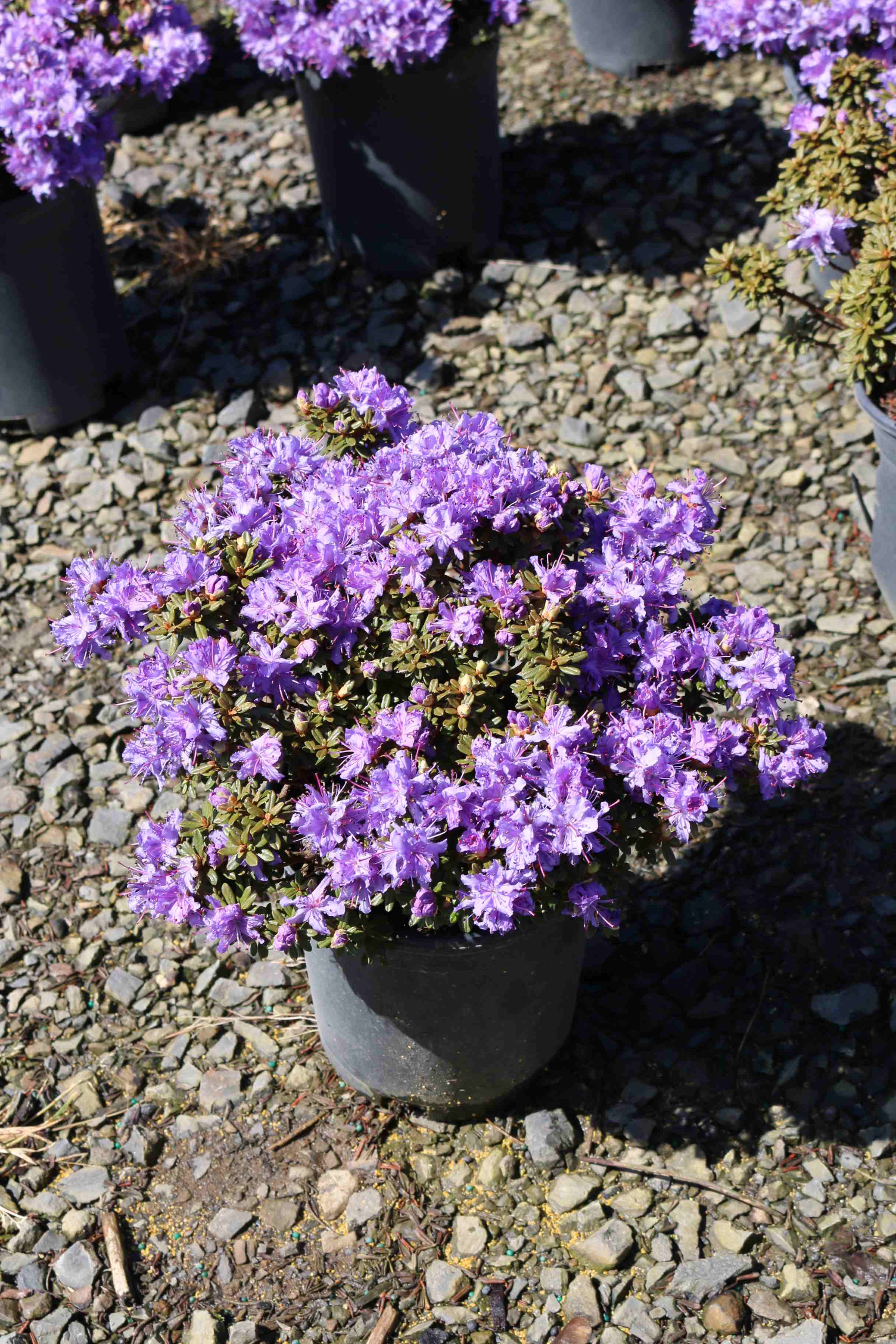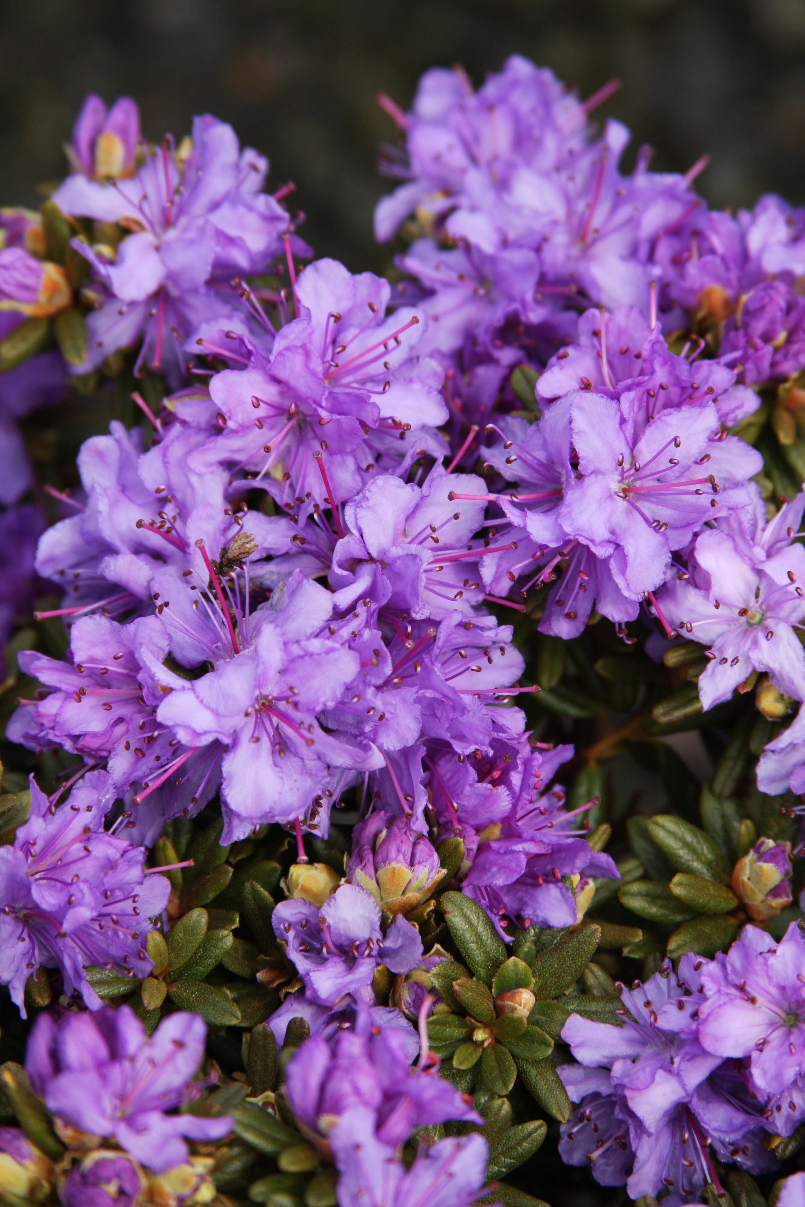 A low dwarf shrub with tiny dark grey-green leaves The foliage is mildly aromatic, especially on warm days. It has early to mid-season, bright purple flowers. H-2. It prefers partial shade to full sun, and moist, cool, acidic well-drained organic soil. Removal of spent blossoms encourages new growth and future flowers.