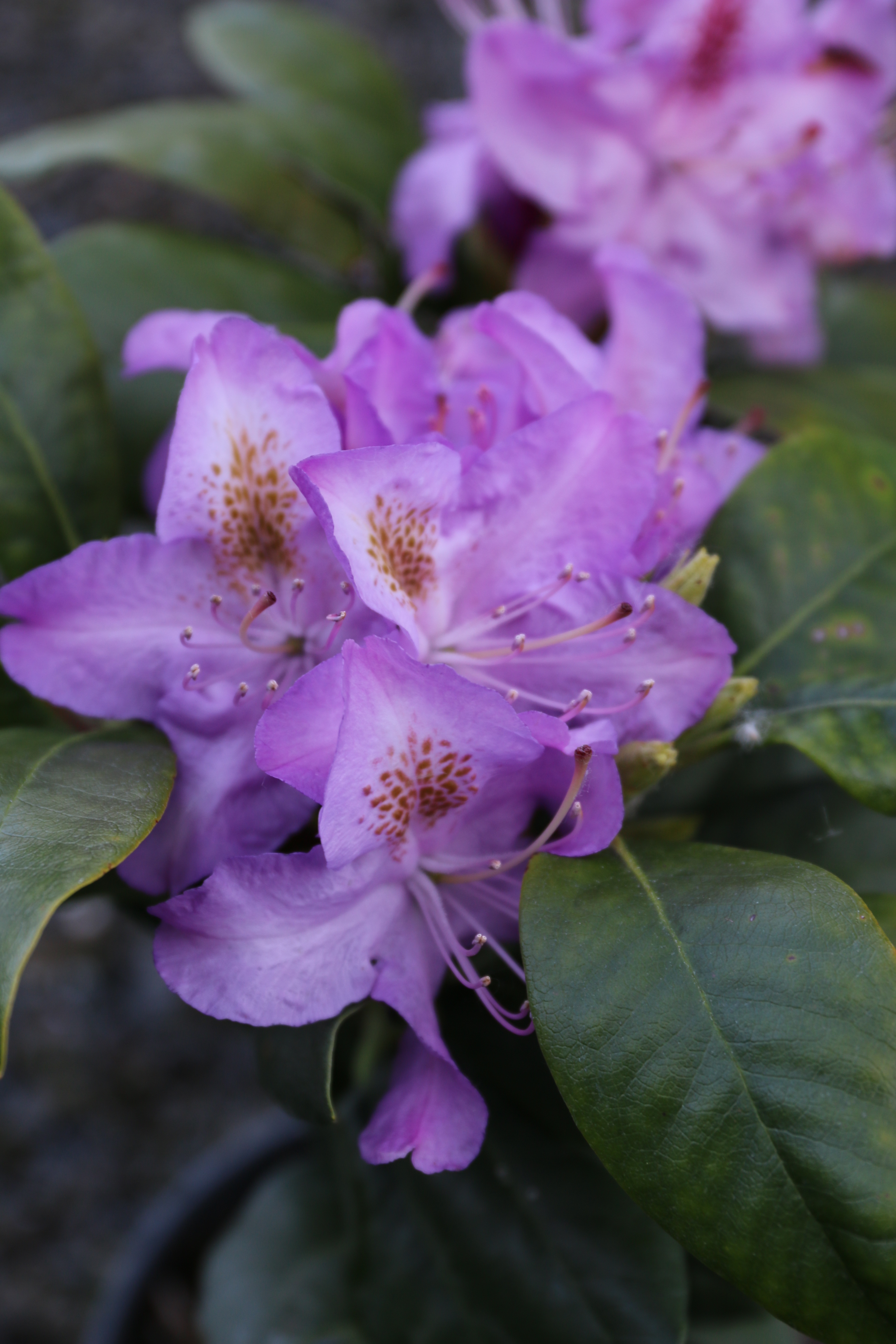 A medium sized, dense and spreading shrub with mid-season flowers. The trusses are light purple, with lighter center and orange-yellow spots on the upper lobe. The leaves have a wavy edge. H-1. It prefers partial shade to full sun, and moist, cool, acidic well-drained organic soil. Removal of spent blossoms encourages new growth and future flowers.